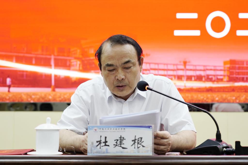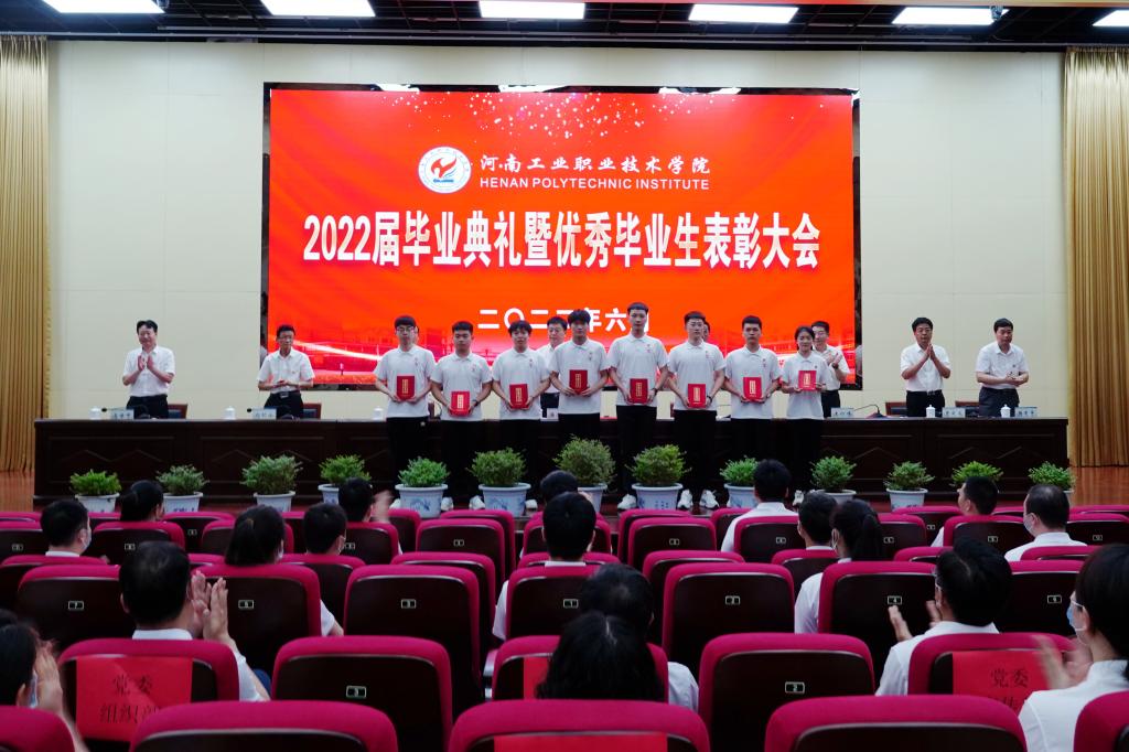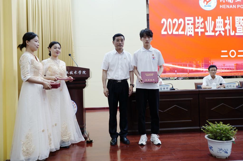 毕业典礼在雄壮的国歌声中拉开帷幕。副校长贾庆成介绍了2022届毕业生情况;党委副书记杜建根宣读了《河南省教育厅关于对2022年河南省优秀应届大中专毕业生名单的公示》和《新葡的京集团8814vip关于表彰2022届优秀应届毕业生的决定》。在激昂欢快的乐曲声中,与会领导为2022届省级优秀毕业生、校级优秀毕业生代表颁发了荣誉证书。