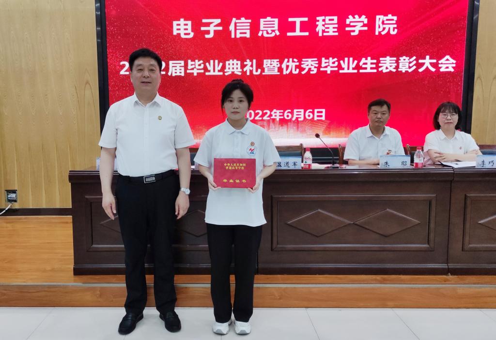 风好正是扬帆时,奋楫逐浪天地宽!6月6日下午,电子信息工程学院在T1127隆重举行2022届毕业生毕业典礼暨优秀毕业生表彰大会。学校党委书记温道军,电子信息工程学院党政领导、学院党政办、团总支、学工科、教学科、招生就业办负责同志,2022届毕业班班主任和各专业教师代表,2022届毕业生代表以及在校生代表参加大会,会议由学院党总支副书记杨旭主持。