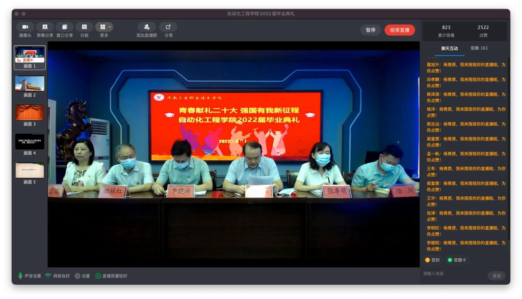 毕业典礼采取“线上+线下”相结合,现场典礼与钉钉网络直播的形式同时进行,33个班级共计一千余名毕业生线上观礼。典礼由学院团总支书记郭桂丛主持。