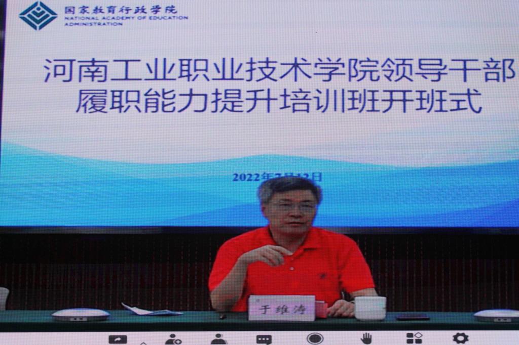 党委书记温道军作开班动员讲话。温书记指出,在全国上下喜迎党的二十大胜利召开的重要时刻,在学校高质量跨越发展爬坡过坎的关键时期,学校和国家教育行政学院共同举办领导干部履职能力提升培训班,是新时期加强学校治理体系和治理能力现代化,建设高素质专业化干部队伍的迫切需要;是落实新修订的职业教育法,增强广大干部适应职业教育改革发展要求的重要举措,也是深入推进学校“观念能力作风建设年”活动,提升领导干部综合素质的有效措施。面对职业教育发展的新形势新任务,领导干部只有不断学习,与时俱进,才能跟上时代前进的步伐,才能更好地推动学校高质量发展。