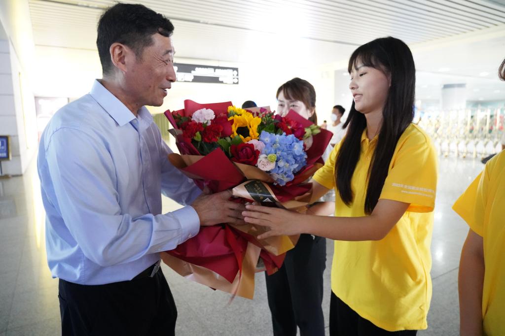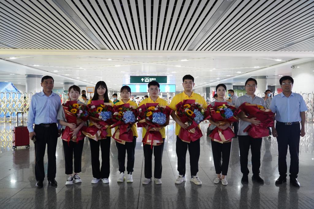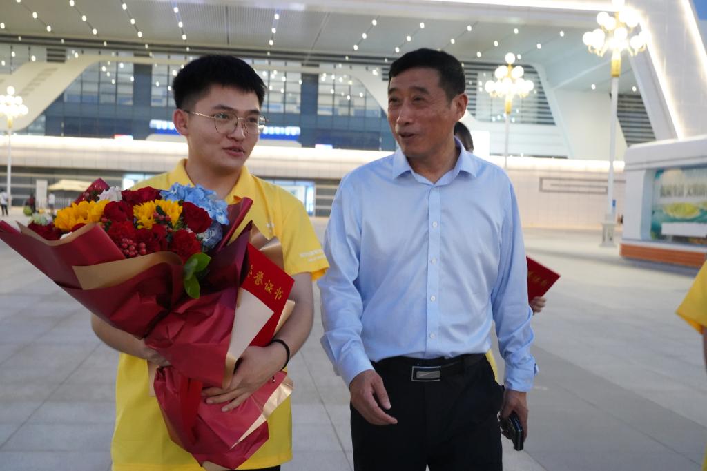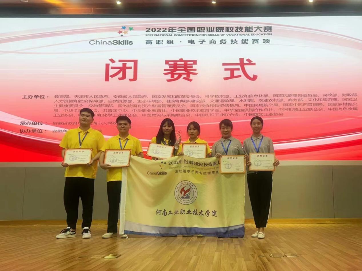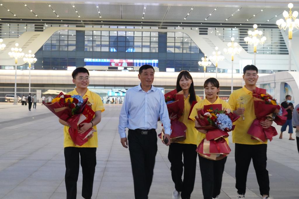 孟夏时节,捷报再传。7月31日,2022年全国职业院校技能大赛“电子商务技能”赛项(高职组)闭幕式在安徽商业职业技术学院举办,由我校经济贸易学院张璐、马春雨老师指导,易成龙、贾思婷、胡梦阳、万草雨四名同学组成的代表队代表河南省参加国赛,从全国30个省(市、区)的63支参赛队中脱颖而出,荣获国赛一等奖。晚上七点,学校校长王伟、副校长贾庆成带领党政办公室、党委宣传部、教务处、经济贸易学院等单位工作人员一同前往高铁站接站,喜迎获奖师生载誉归来。
