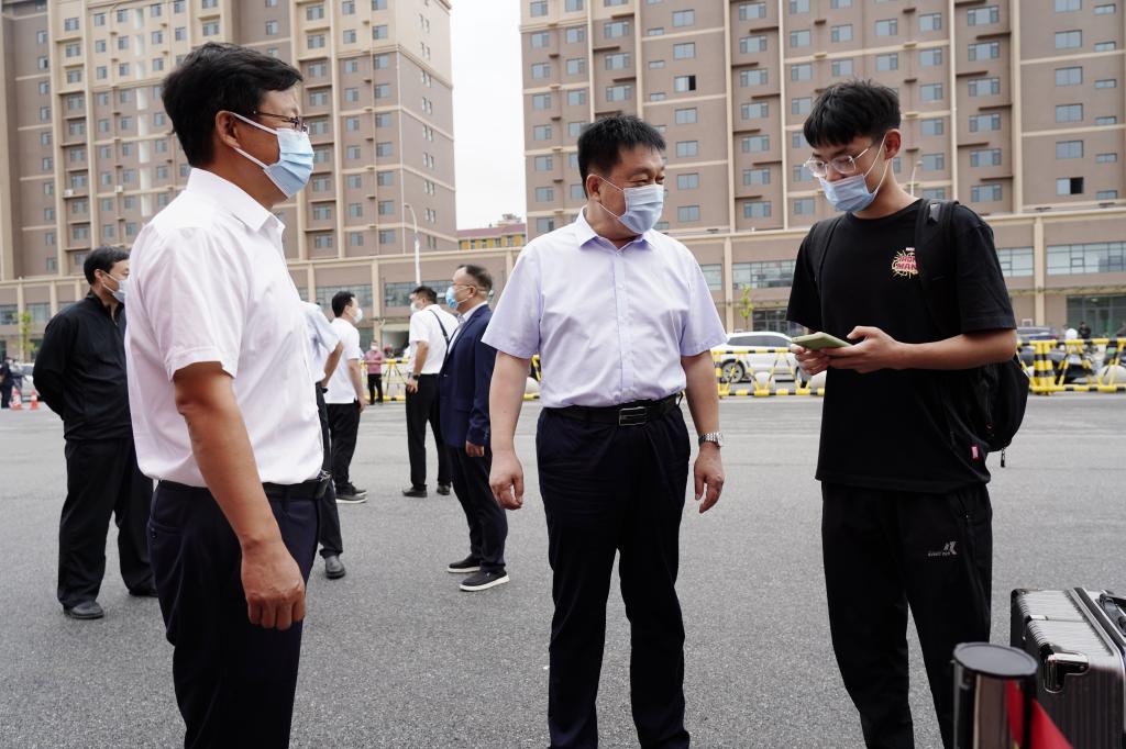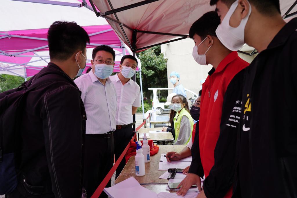 在光武路校区,副校长王仁伟详细了解学生返校报到、体温检测及核酸检测情况,查看学生入校流程,亲切慰问返校学生,检查督导疫情防控措施落实情况,要求全体工作人员要严格执行防疫规定,从严从细落实防控措施,切实做好新学期学生返校报到工作。并强调,当前疫情防控形势严峻,要始终绷紧疫情防控这根弦,持续做好校园管控、后勤保障、应急处置等工作,稳步推进各项工作有序开展。