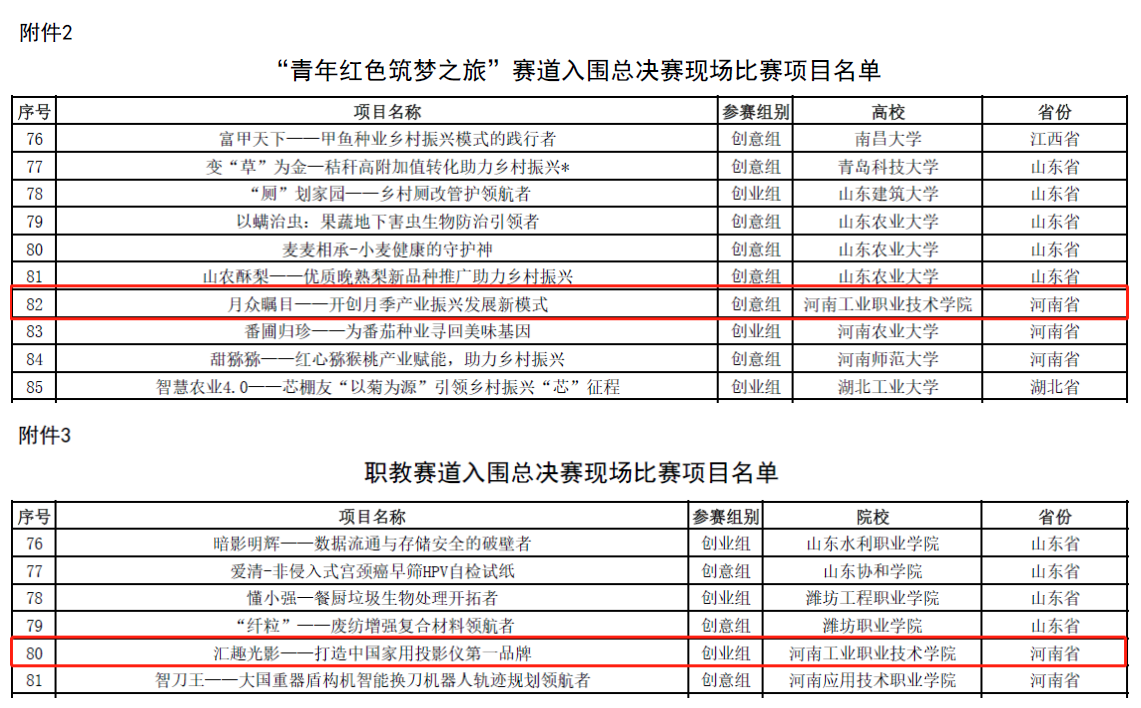 10月31日,教育部公布了第八届中国国际“互联网+”大学生创新创业大赛国赛总决赛名单,我校来自建筑工程学院的汇趣光影——打造中国家用投影仪第一品牌,来自电子信息工程学院的月众瞩目——开创月季产业振兴发展新模式,2个项目成功进入国赛总决赛争夺本届大赛金奖。今年,河南省有25个项目入围国赛总决赛,其中高职高专院校6所共计10个项目,我校的2个入围项目分别以职教赛道、红旅赛道河南省第一名的成绩入围国赛总决赛。尤其红旅赛道,全国只有8所职业院校入围国赛和本科同台竞技。