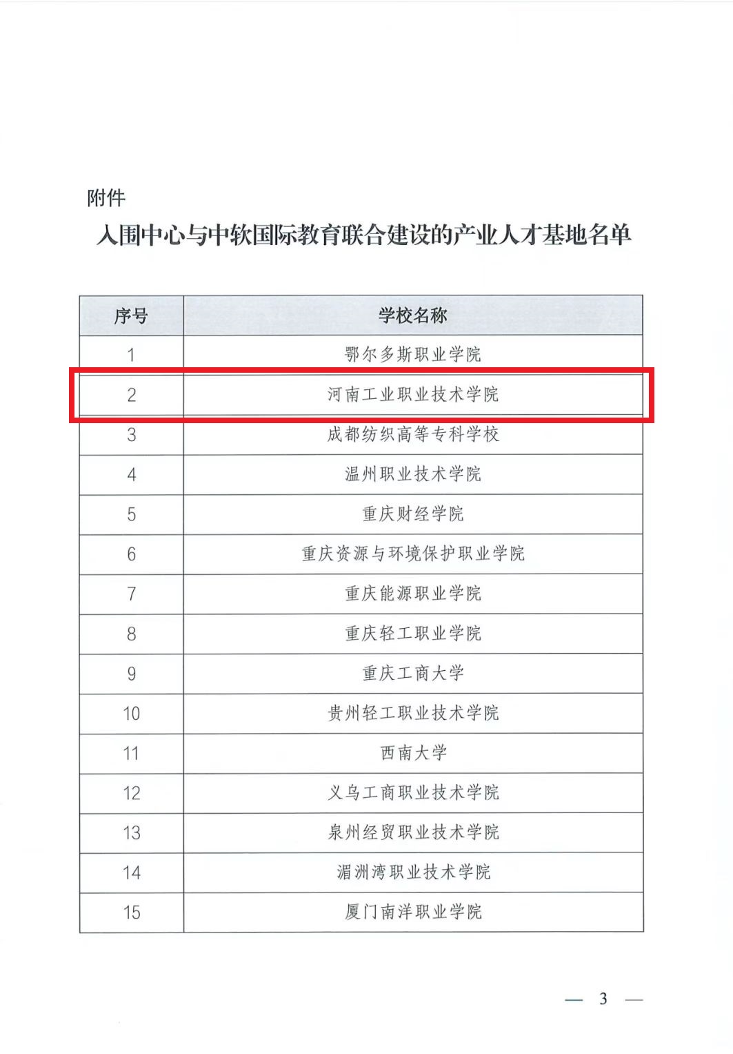 12月13日,工业和信息化部人才交流中心发布《关于公布入围中心与北京中软国际教育科技股份有限公司联合建设的产业人才基地名单的通知》,经专家评审,共有49所高校入围工业和信息化部人才交流中心与中软国际教育科技集团联合建设的工业和信息化重点领域产业人才基地名单,我校排名第2成功入选。