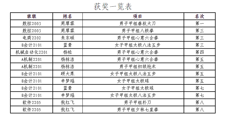 我校武术队全体教练员和运动员克服疫情影响,经过刻苦训练,载誉归来,为我校2022年度体育赛事画上圆满句号。本次比赛展示了我校学生良好的竞技水平和精神风貌,为校争取了荣誉,也体现了我校体育工作的成果,更是学校长期重视学生体育赛事的结果。接下来武术队将在校团委的带领下,积极投身到寒假社会实践中,推广武术项目,把健康带给家人、邻居、亲朋好友,星星之火,可以燎原,做到“关爱你我他(她),温暖千万家”。在未来的学习生活中武术队将不忘初心、砥砺前行、再创佳绩。(供稿/体育教学部 图文/冯庆雨 单位审核/孟升 编审/袁贤)