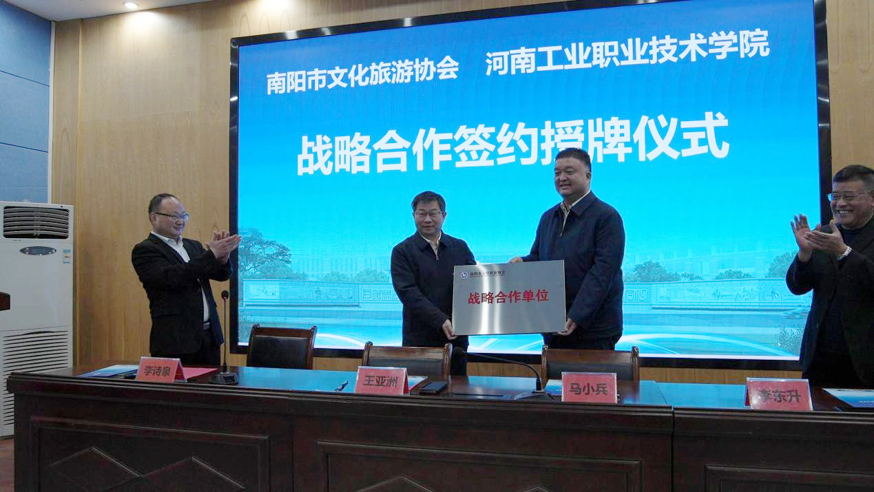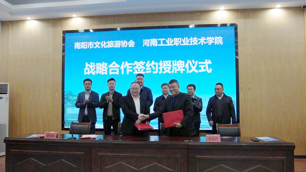 为不断推进校企深度融合,提升人才培养质量,3月29日上午我校与南阳市文化旅游协会在图书馆T1126会议室举行了校企战略合作签约授牌仪式。南阳市文化旅游协会会长王亚洲,党总支书记、常务副会长李东升,文旅协会相关负责人,学校党委委员、副校长马小兵,文化旅游与国际教育学院负责人及部分师生代表共同出席仪式。仪式由文化旅游与国际教育学院党总支书记李诗泉主持。