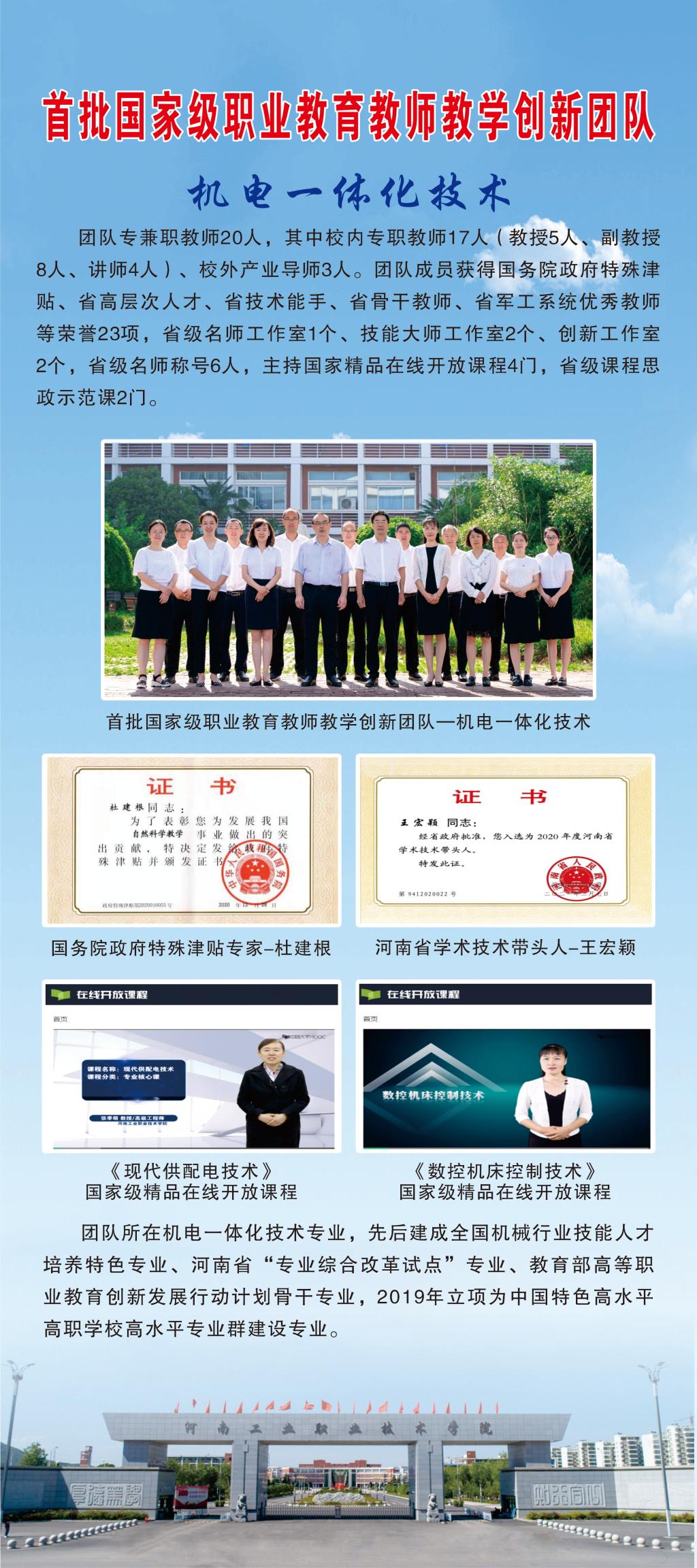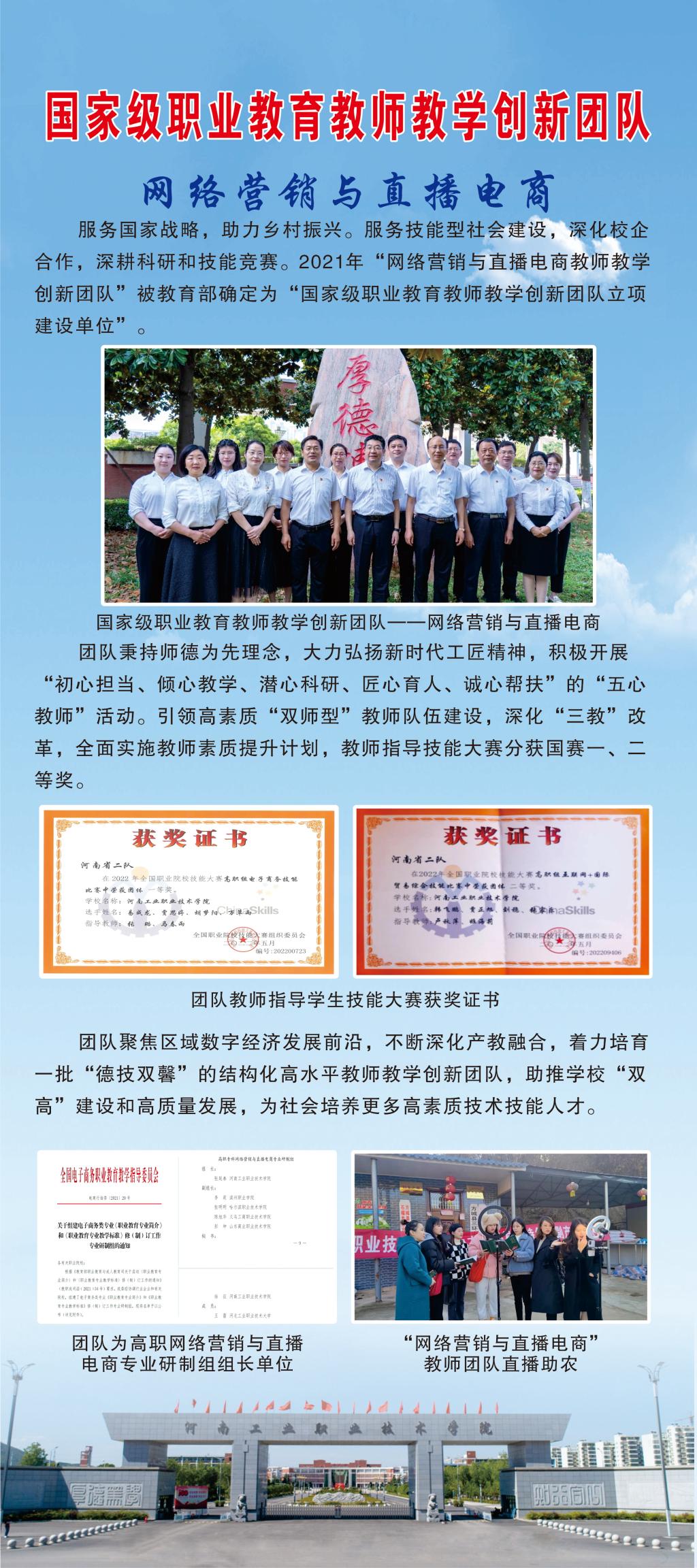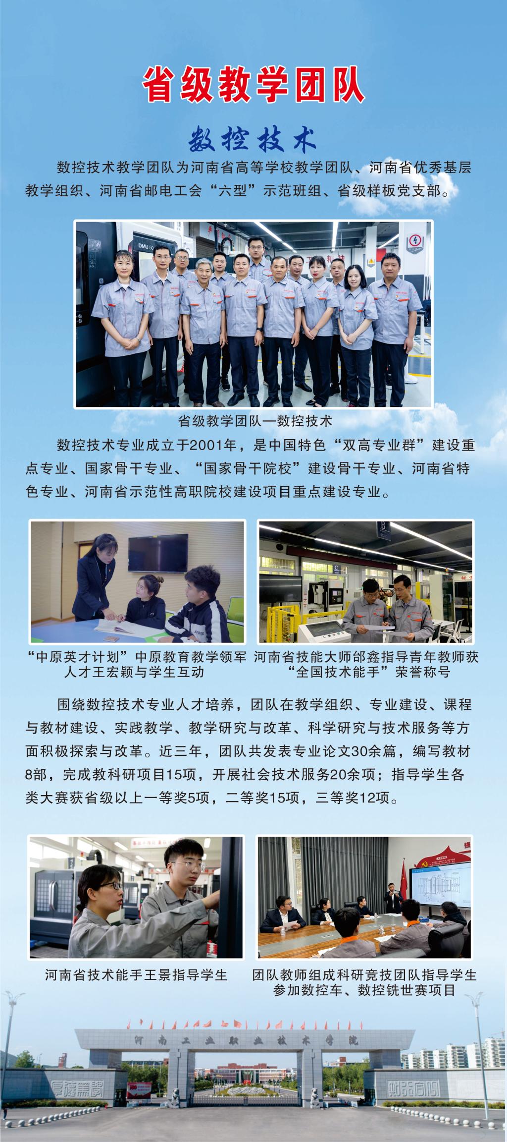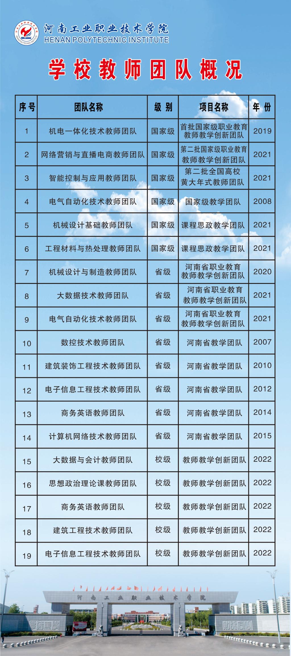 编者按:教师团队建设是推进职业教育“双师型”教师队伍高质量发展的有力抓手和重要举措,近年来,学校全面构建“国家级、省级、校级”三级教师团队建设格局,探索实践“夯实三大基础、发挥三大作用、构建三大体系,凝练一种文化”的“3331”教师团队建设路径,提炼形成“双线并行、五位一体”的教师教学创新团队建设经验,培育了一批示范引领、协同创新的教师团队。近日,党委宣传部、党委教师工作部筹备制作“教师团队风采展”,生动展示学校国家级、省级教师团队风采,客观记录在“双高计划”建设的引领下,教师团队建设的创新举措和显著成效。(供稿/党委宣传部 党委教师工作部 图文汇编/刘天恒 冯金冉 单位审核/王磊 杨爽 编审/杨洋)