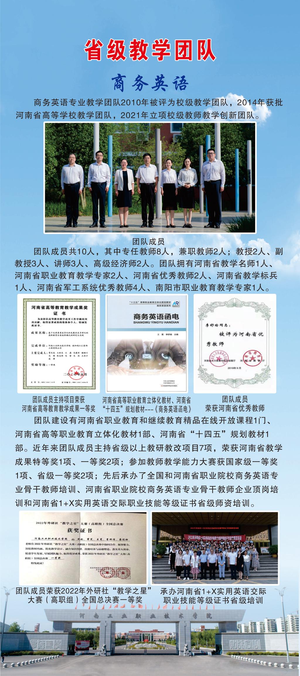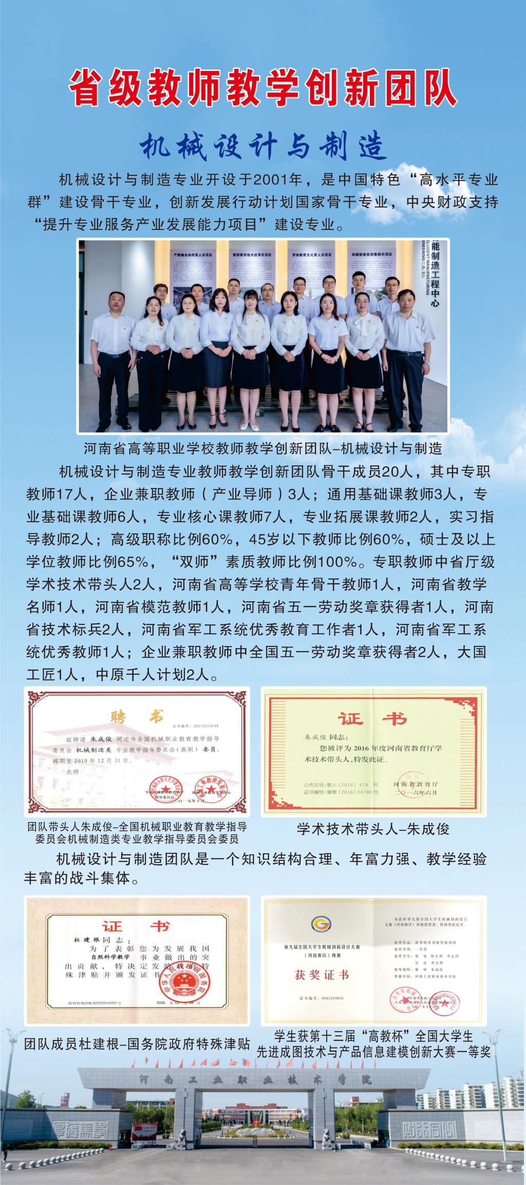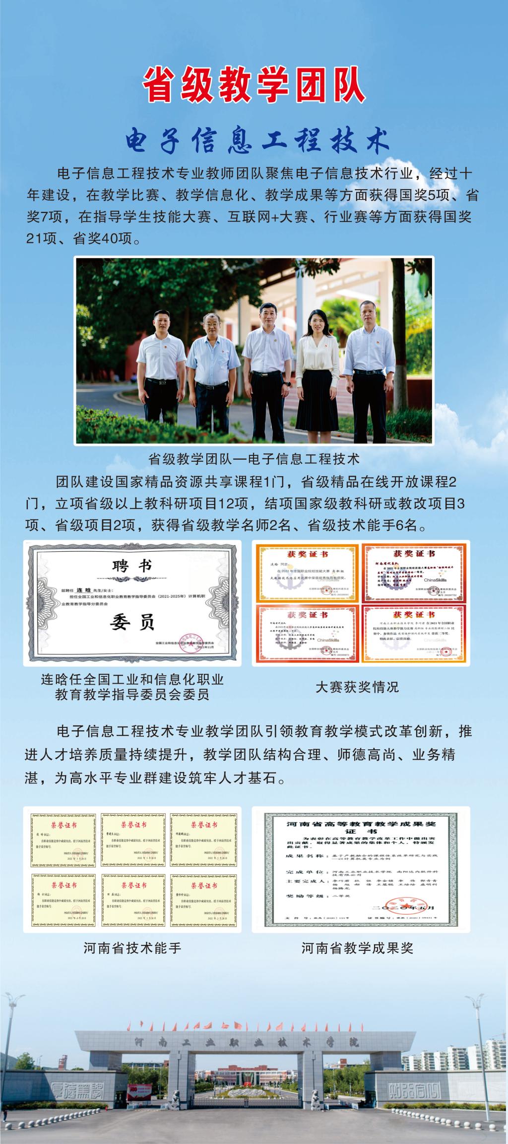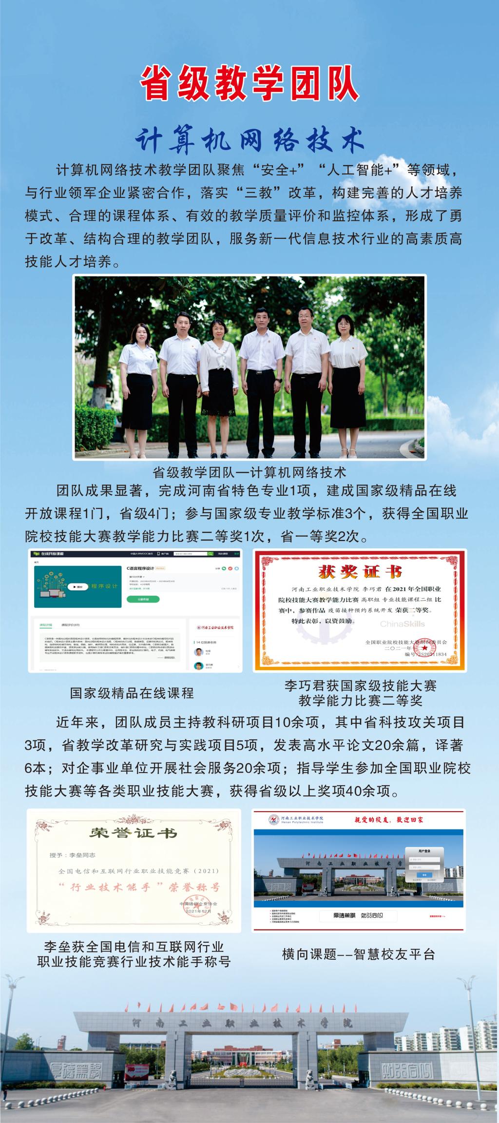 编者按:教师团队建设是推进职业教育“双师型”教师队伍高质量发展的有力抓手和重要举措,近年来,学校全面构建“国家级、省级、校级”三级教师团队建设格局,探索实践“夯实三大基础、发挥三大作用、构建三大体系,凝练一种文化”的“3331”教师团队建设路径,提炼形成“双线并行、五位一体”的教师教学创新团队建设经验,培育了一批示范引领、协同创新的教师团队。近日,党委宣传部、党委教师工作部筹备制作“教师团队风采展”,生动展示学校国家级、省级教师团队风采,客观记录在“双高计划”建设的引领下,教师团队建设的创新举措和显著成效。(供稿/党委宣传部 党委教师工作部 图文汇编/刘天恒 冯金冉 单位审核/王磊 杨爽 编审/杨洋)