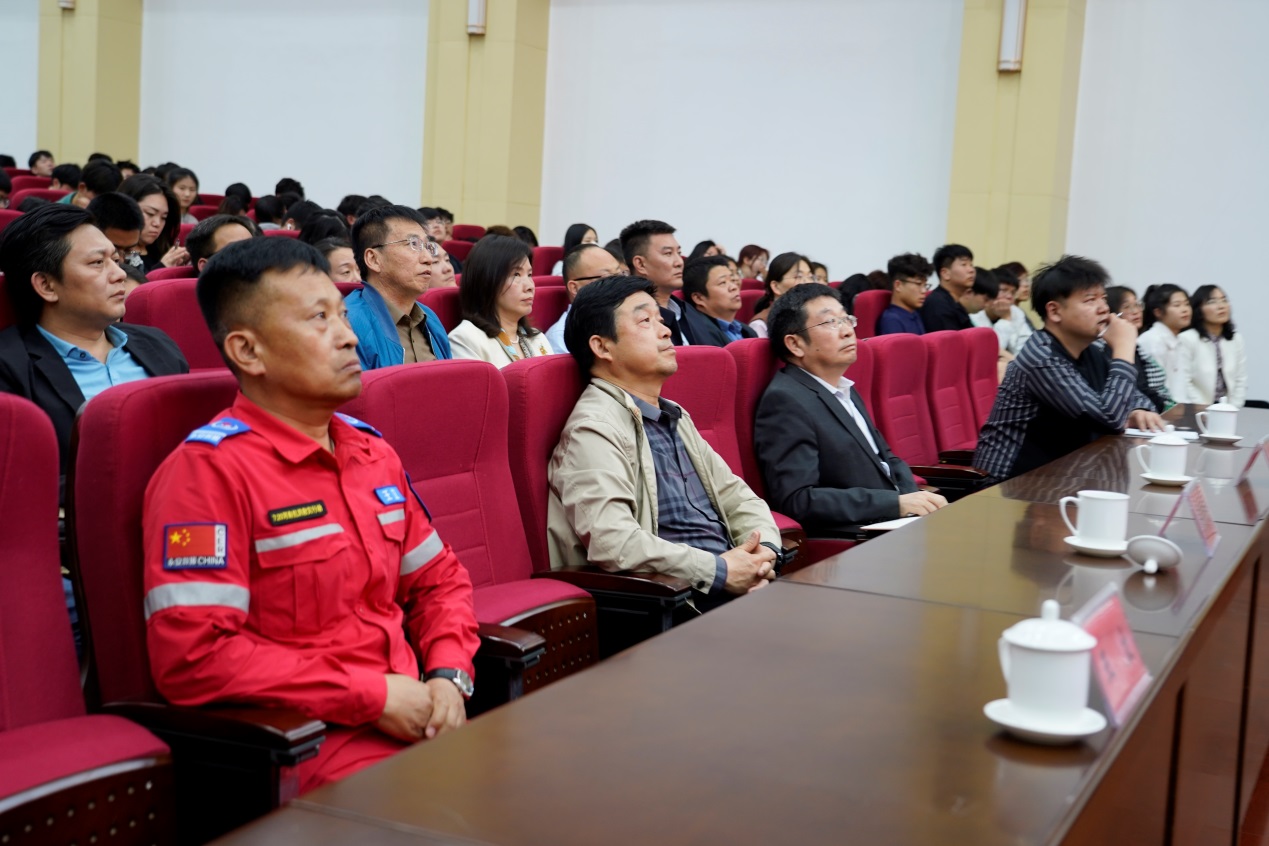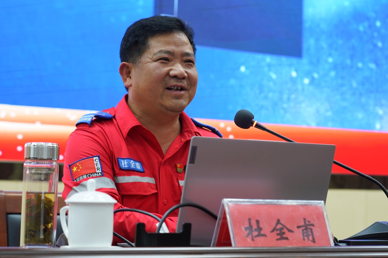 会场座无虚席,杜全甫以《志愿红点亮生命之光》为题,介绍了永安应急救援队成立以来开展的救援工作和社会影响,并结合自身实际,以朴实的语言和感人的事例,为大家上了一堂生动精彩的教育课,分享了他在2013年四川雅安“4·20”抗震救援、2020年新冠肺炎疫情防控、2021年郑州“7·20”抗洪抢险等志愿服务工作中,无畏艰辛救助他人的故事,同时,向在场师生科普了救护技能。杜全甫勉励同学们要坚定信仰,砥砺品德,珍惜当下,勤奋学习,努力成长为有理想、有本领、有担当的社会主义建设者和接班人,让青春在全面建设社会主义现代化国家的火热实践中绽放绚丽之花。