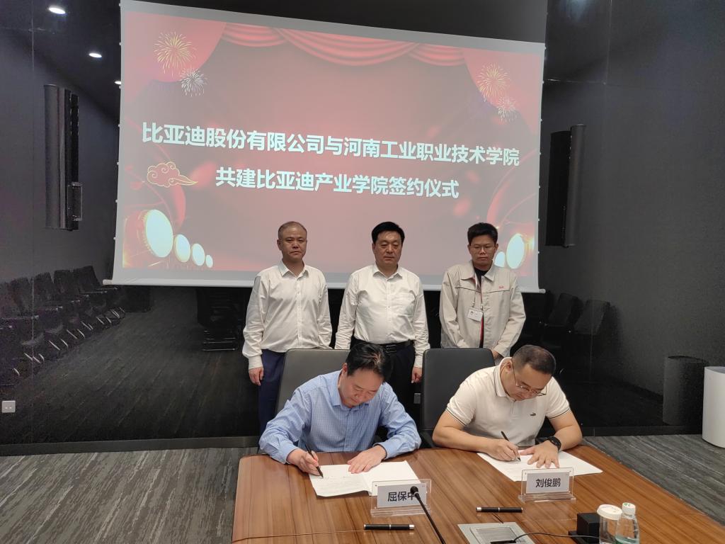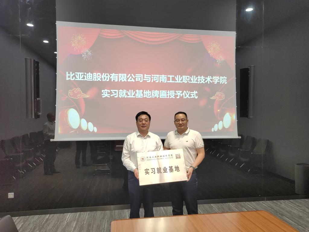 会后,双方签署了《比亚迪校企合作产业学院协议》,并举行了学校实习就业基地授牌仪式。