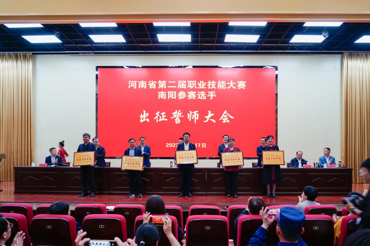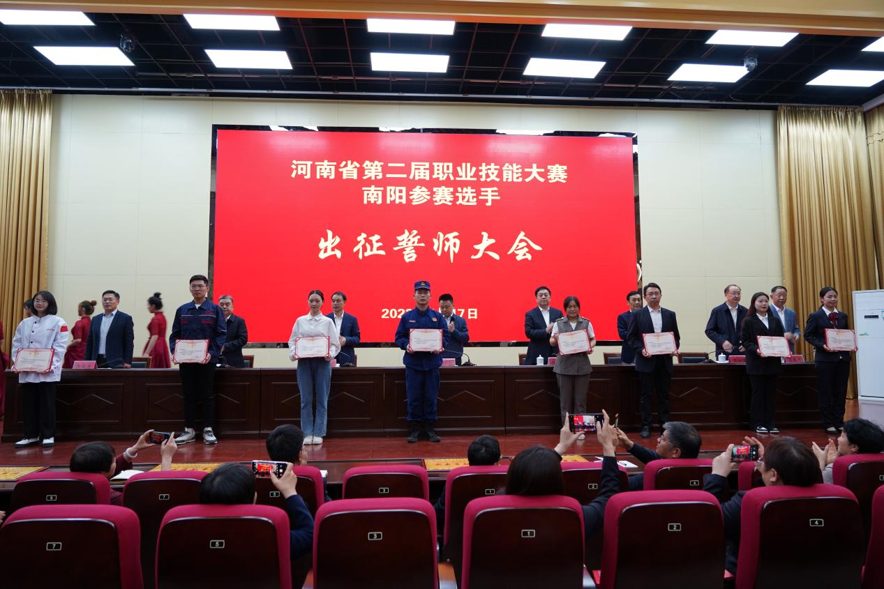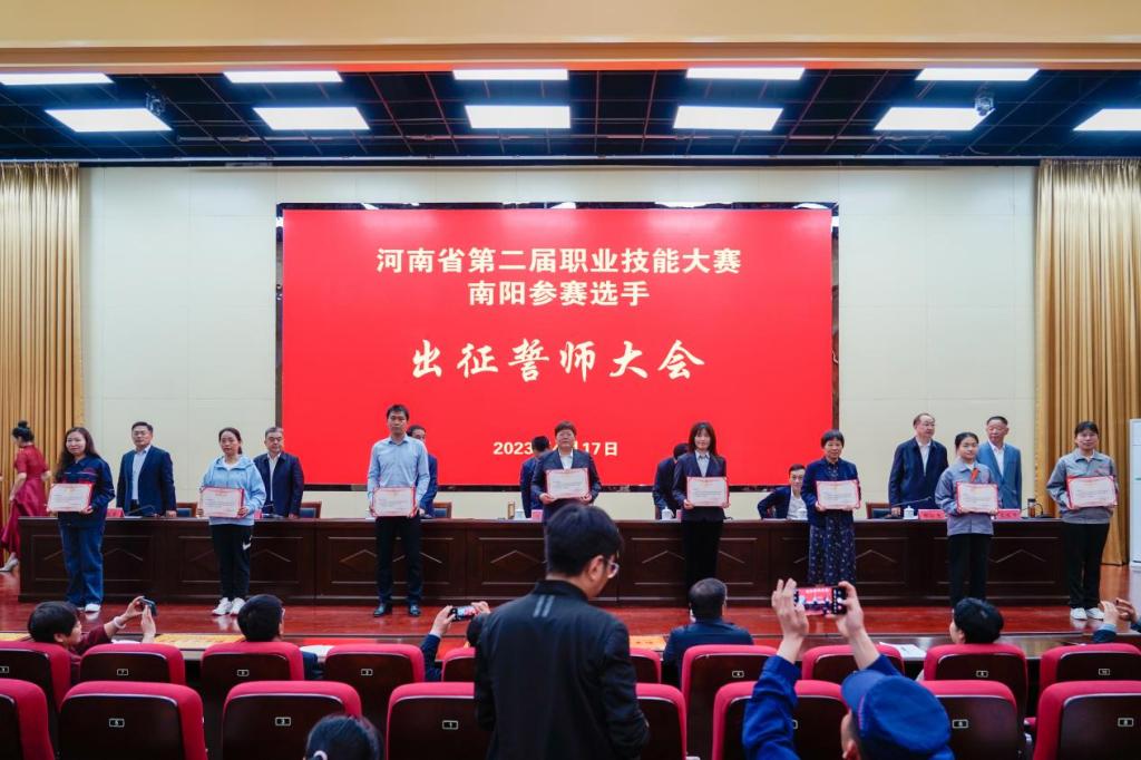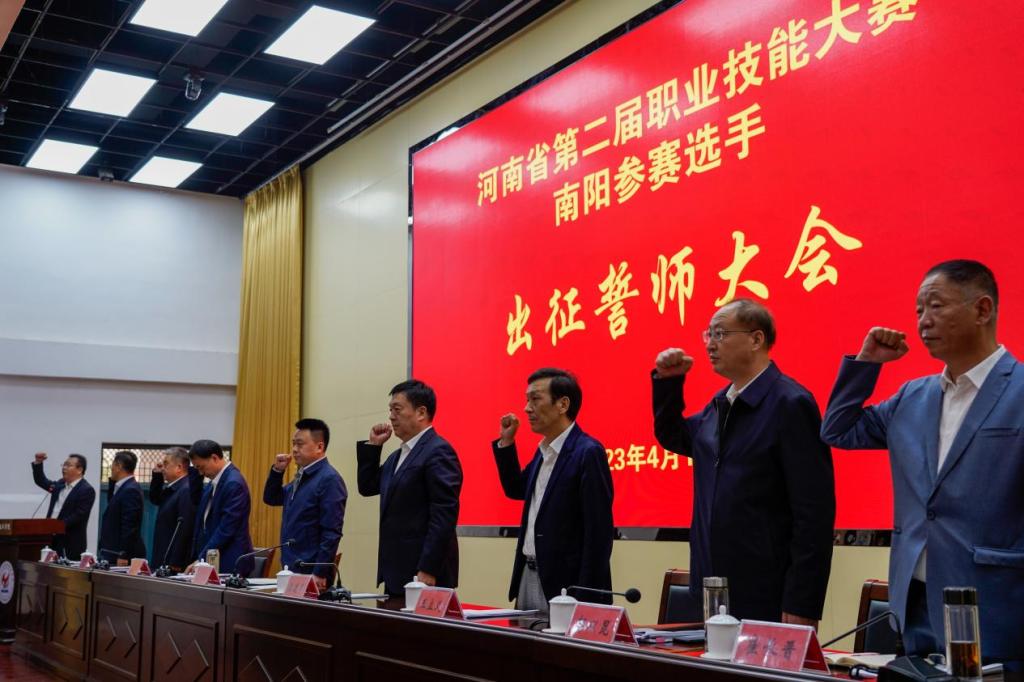 河南省第二届职业技能大赛将于4月25-28日正式开幕。本届大赛比赛项目有60个,赛项设置对标世赛、国赛技术标准和办赛模式,参赛选手都代表了相关行业较高的技能水准,比赛整体强度大、难度高。誓师大会在我校的成功举办,擂响了拼搏的战鼓,各参赛选手要响应誓师大会号召、踔厉奋发,勇毅前行,苦练本领,始终保持昂扬的战斗姿态,在赛场上尽显技能风采,为学校更为南阳在本次大赛中更加出彩而努力拼搏。