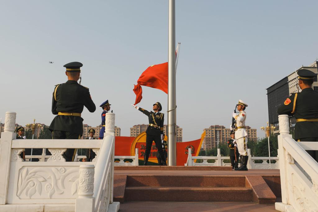 国旗招展士气振,朝霞初绽破云生。“向国旗敬礼!”随着国旗仪仗队一声铿锵有力的口令,全体师生面对国旗肃立,行注目礼并怀着崇高的敬意和满腔的热情高唱国歌,庄严的五星红旗伴着嘹亮的国歌冉冉升起!