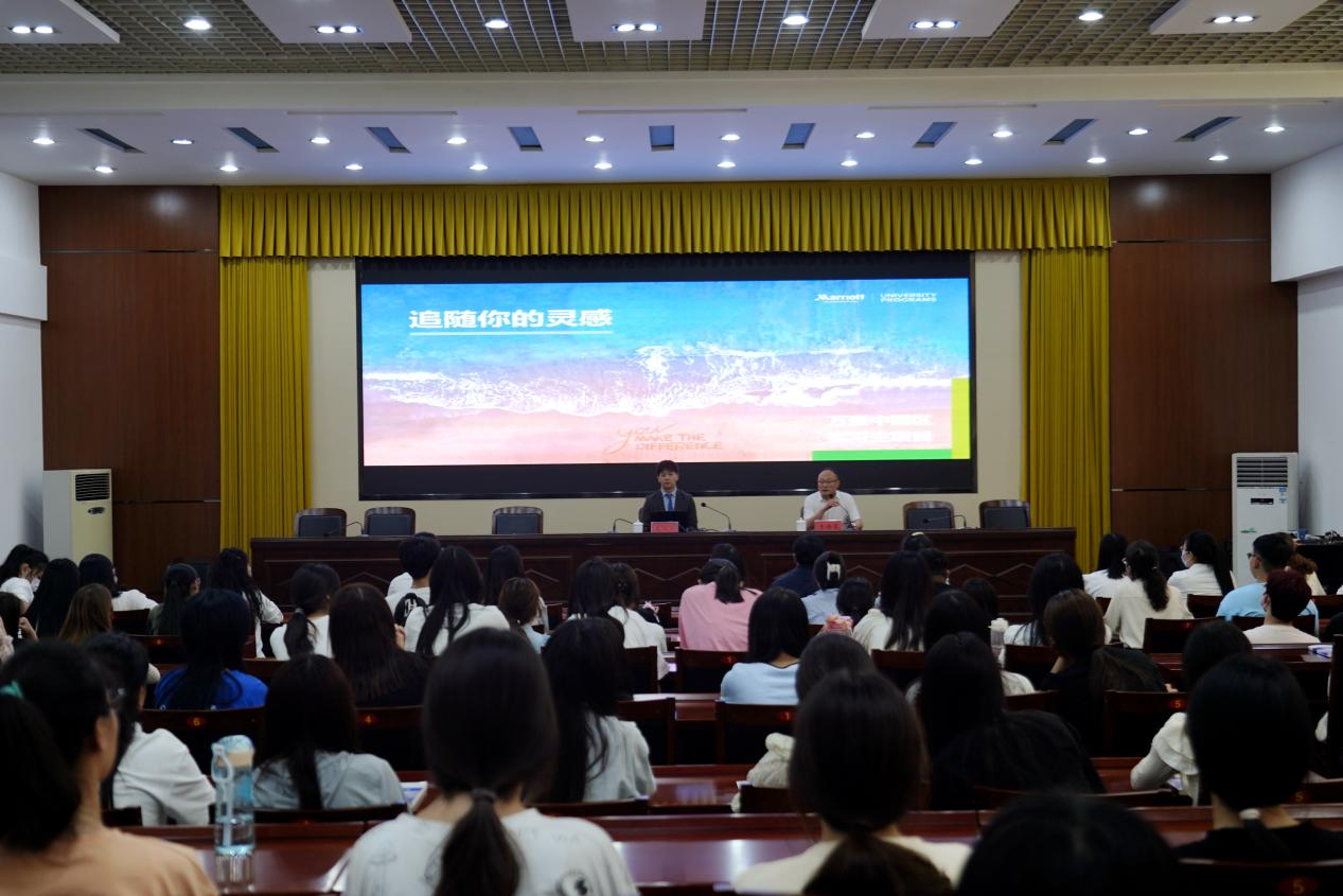 仪式结束后,双方合影留念。最后,朱程作了题为《追随你的灵感:开启万豪之旅》的讲座,全体与会师生认真聆听了此次专题讲座。