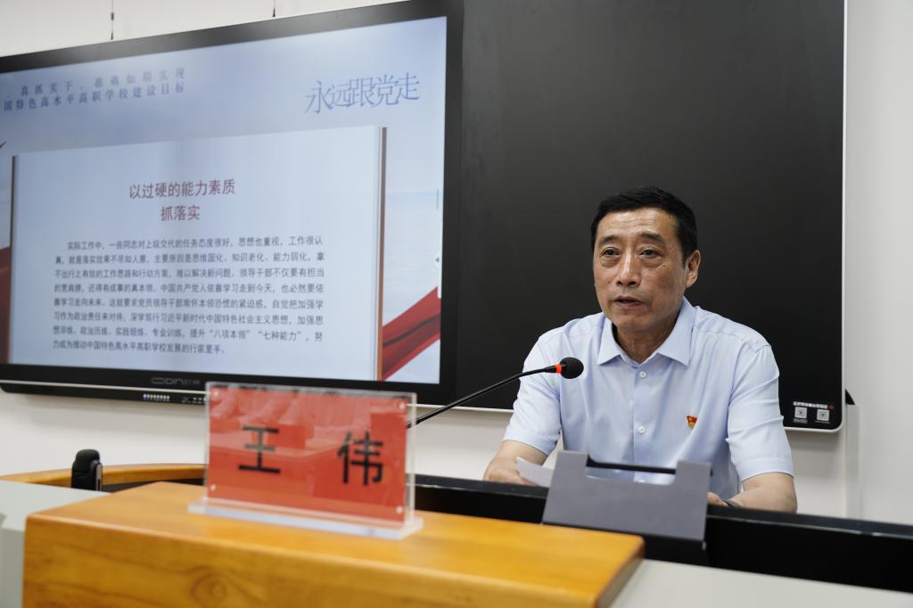 王伟从“什么是马克思主义、怎样坚持和发展马克思主义”、“新时代坚持和发展什么样的中国特色社会主义、怎样坚持和发展中国特色社会主义”、“建设什么样的社会主义现代化强国、怎样建设社会主义现代化强国”、“建设什么样的长期执政的马克思主义政党、怎样建设长期执政的马克思主义政党”、“什么是中华文明、怎样继承和弘扬中华文明”五个回答中,阐述了如何把握习近平新时代中国特色社会主义思想最主要内容和完整框架。针对如何写好习近平新时代中国特色社会主义思想在学校落地的奋进之笔、得意之作,加快推进中国特色高水平高职学校建设,王伟从三个方面进行要求:一是要学思践悟,准确把握习近平总书记关于职业教育重要论述的核心要义,围绕“怎么看职业教育、为谁办职业教育”“职业教育培养什么人、怎样培养人”“办什么样的职业教育、怎么办好职业教育”的基本问题,找准职业教育的办学方向、发展方向、发展重点及发展路径。二是要抓住关键,在决胜“双高计划”建设攻坚战、决胜“提质培优”攻坚战、决胜“申本”攻坚战、加快评价体系改革上凝心聚力、奋力拼搏,加快推进我校“双高”道路上的高质量发展。三是要真抓实干,以强烈的政治自觉抓落实、以过硬的能力素质抓落实、以科学的方式方法抓落实,确保如期实现中国特色高水平高职学校建设目标。最后,王伟希望大家长立奋斗之志、长抓奋斗之行、长思奋斗之效,始终保持“越是艰险越向前”的闯劲儿,“狭路相逢勇者胜”的拼劲儿,以“干实、干成、干好”的工作状态,迎难而上的豪迈,担当作为、勇挑重担、脚踏实地、奋力攻坚,为实现中国特色高水平高职学校建设目标作出新的更大贡献!