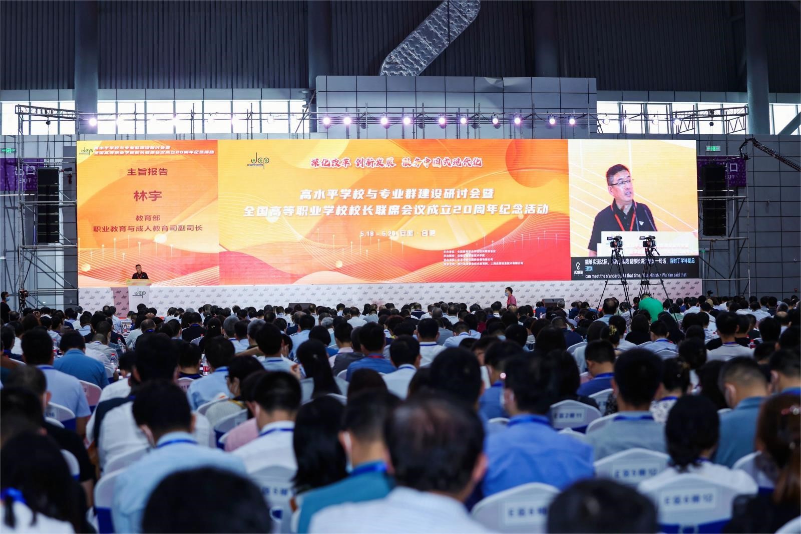 5月19日至20日,由全国高等职业学校校长联席会议主办,安徽交通职业技术学院承办,北京中教仪国际会展有限公司协办的“高水平学校与专业群建设研讨会暨全国高等职业学校校长联席会议成立20周年纪念活动”在安徽合肥举办。会议深入学习贯彻党的二十大精神,落实中共中央办公厅、国务院办公厅《关于深化现代职业教育体系建设改革的意见》,以“深化改革 创新发展 服务中国式现代化”为主题,通过主题报告、经验分享、互动交流、成果展示等形式,就高职教育在深化改革、双高建设、人才培养、社会服务和创新发展等方面的经验成果进行交流研讨,推动高职教育高质量发展。教育部职业教育与成人教育司副司长林宇,安徽省委教育工委委员、省教育厅副厅长储常连,安徽省交通运输厅党组成员、副厅长孙革新,教育部学校规划建设发展中心主任李平,全国高等职业学校校长联席会议主席董刚等领导出席了会议。我校党委书记温道军,副校长贾庆成带领发展规划处、教务处、机械工程学院、电子信息工程学院等单位部门负责人参加了会议。