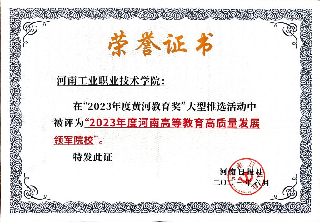 近日,由河南日报社主办的河南省第十四届黄河教育论坛暨“2023年度黄河教育奖”评选活动顺利举行,我校获评“2023年度河南高等教育高质量发展领军院校”荣誉称号。