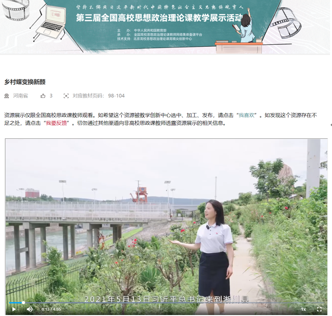 我校马克思主义学院教师陆正芳的作品《江山》、魏丹丹的作品《乡村蝶变换新颜》,分别入围《习近平新时代中国特色社会主义思想》和《思想道德与法治》课程教学展示思政课教学资源共享单元。