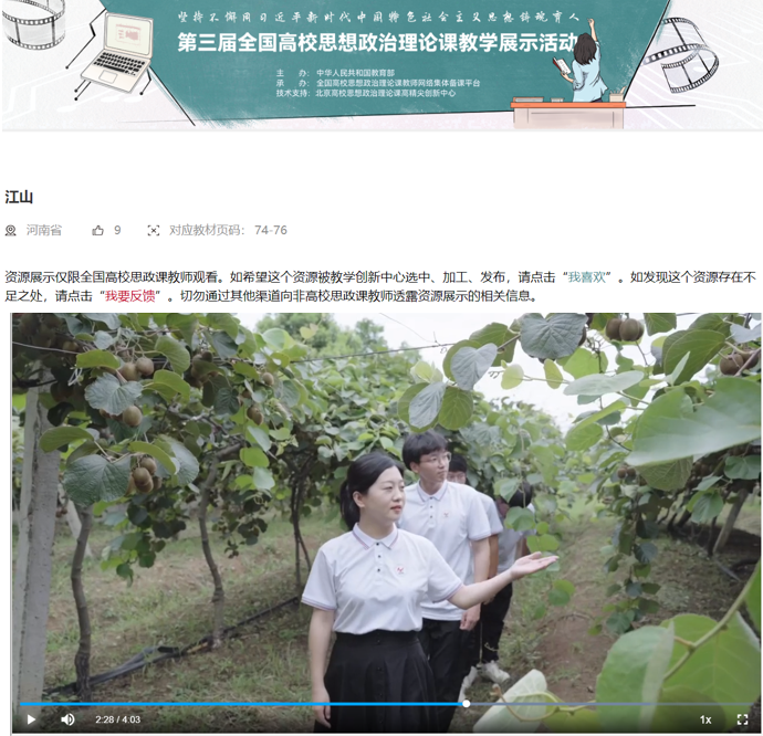 根据教育部办公厅关于《开展第三届全国高校思想政治理论课教学展示活动的通知》要求,我校高度重视,精心安排部署,积极做好教学资源视频录制、上传等工作。此次展示活动面向全国普通高等学校,围绕“新时代伟大变革”主题,针对大学生关注的社会热点问题以及各门思政课教学需要,结合“一省一策思政课”集体行动成果,展示共享近年开发的思政课教学资源,经教育部审核我省共有34所高校、57个资源入围。
