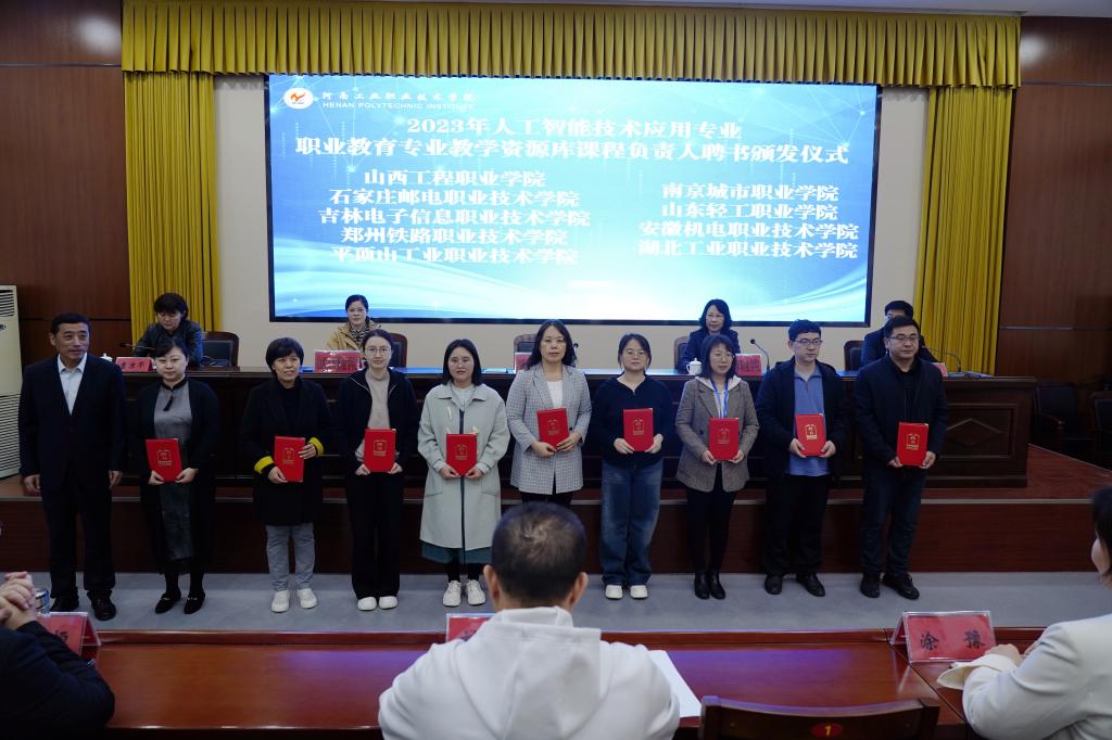 王宇宣读人工智能技术应用专业职业教育专业教学资源库联盟章程,建设院校互相讨论并通过此章程;江景宣读人工智能技术应用专业智慧教研室成立文件。