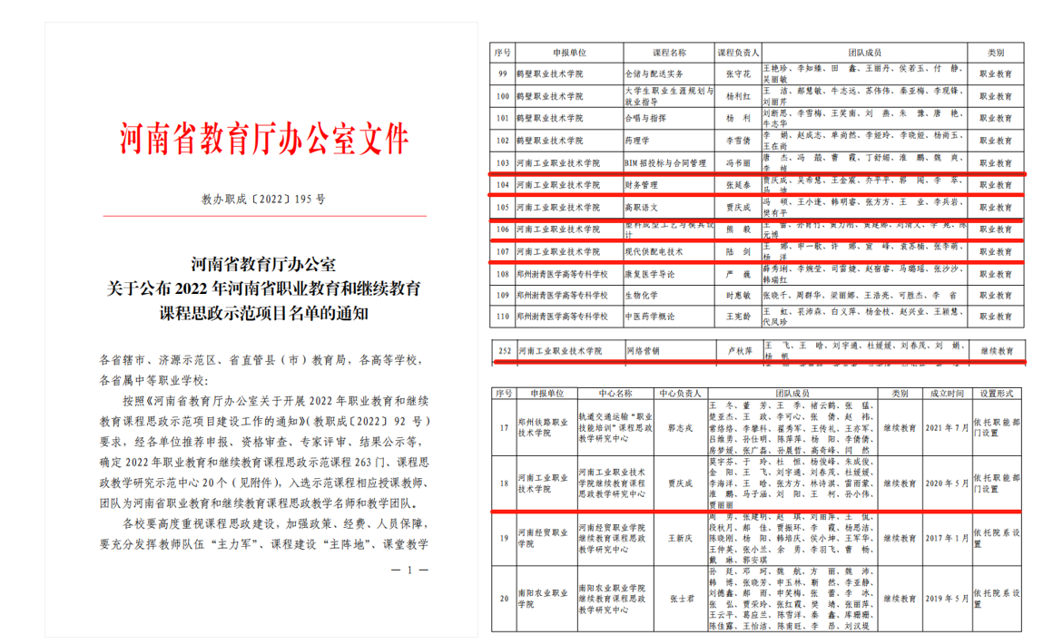 近日,河南省教育厅公布了2022年省级课程思政示范项目名单,我校《BIM招投标与合同管理》《财务管理》《高职语文》《塑料成型工艺与模具设计》《现代供配电技术》5门课程被认定为河南省职业教育课程思政示范