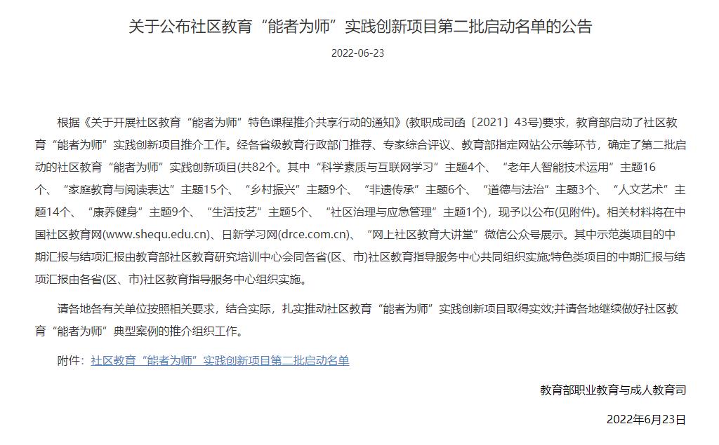 2022年6月23日,教育部职业教育与成人教育司发布了社区教育“能者为师”实践创新项目第二批启动名单的公告,我校社区学院组织申报、基础科学教学部王劲松老师主持的《基于开发高质量课程资源的社区教育实践活