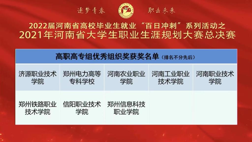 2022年5月20日,由河南省教育厅、河南省发展和改革委员会等七部门共同主办,郑州大学、河南省大中专学生就业服务中心共同承办的2021年全省大学生职业生涯规划大赛总决赛,经过两天的激烈角逐,圆满落下帷