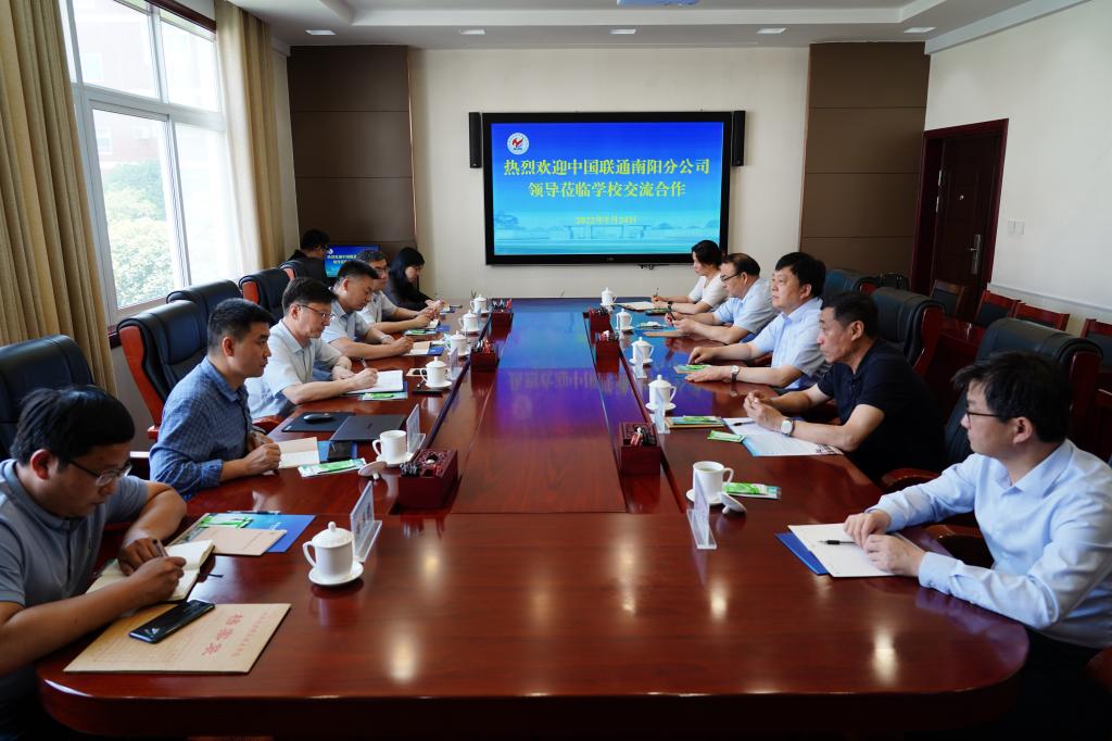 5月24日上午,中国联通南阳分公司总经理陈世刚、副总经理邢向华一行6人到我校交流工作。学校党委书记温道军、校长王伟、党委副书记杜建根出席,党政办公室、信息化管理办公室负责人参加。双方共同观看了学校宣传