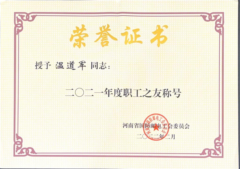 近日,河南省国防邮电工会下发《河南省国防邮电工会委员会关于表彰2021年先进集体和先进个人的决定》(豫国邮工〔2022〕20号),我校党委书记温道军同志被授予“职工之友”荣誉称号,校工会被授予“工会工