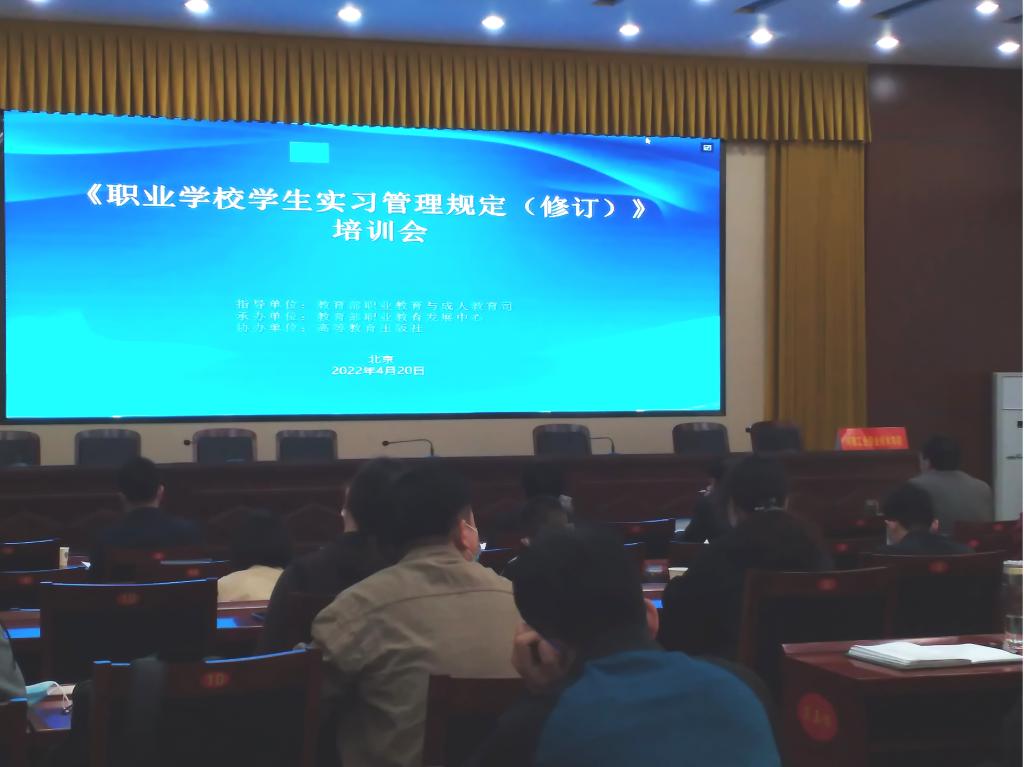 2022年4月20日,学校按照省教育厅要求组织参加了《职业学校学生实习管理规定(修订)》政策解读线上培训会,培训会由教育部职业教育与成人教育司主办、教育部职业教育发展中心承办、高等教育出版社协办,教育