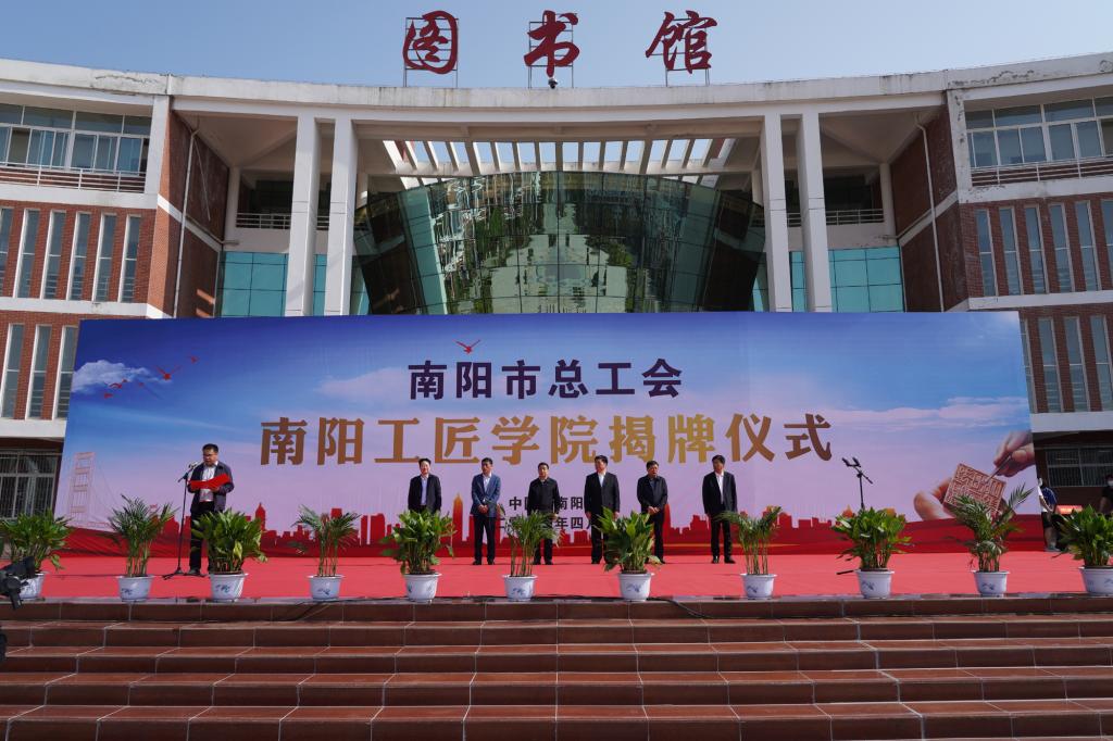 4月22日,南阳工匠学院揭牌仪式在我校孔明路校区神舟广场举行,南阳市人大党组副书记、市总工会主席李甲坤,南阳市总工会党组书记、副主席赵浩,学校党委书记温道军、校长王伟、副校长贾庆成、工会主席屈保中出席