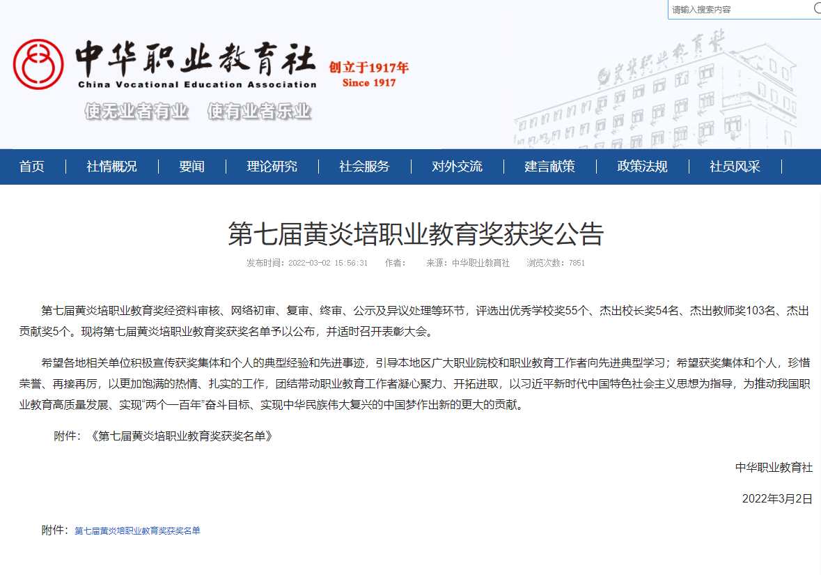 3月2日,中华职业教育社公布了第七届黄炎培职业教育奖获奖名单,本届黄炎培职业教育奖共设立优秀学校奖、杰出校长奖、杰出教师奖、杰出贡献奖等四个奖项,我校荣获优秀学校奖。河南省职业院校中仅有两所高校获奖。