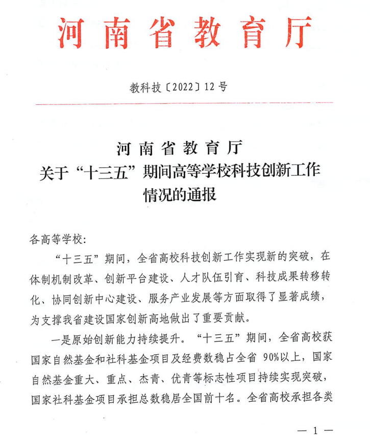 近日,河南省教育厅发布《河南省教育厅关于“十三五”期间高等学校科技创新工作情况的通报》,我校科技外事处荣获“河南省高校科研管理工作先进集体”荣誉称号。近年来,我校高度重视科研工作,在科研平台建设、重大