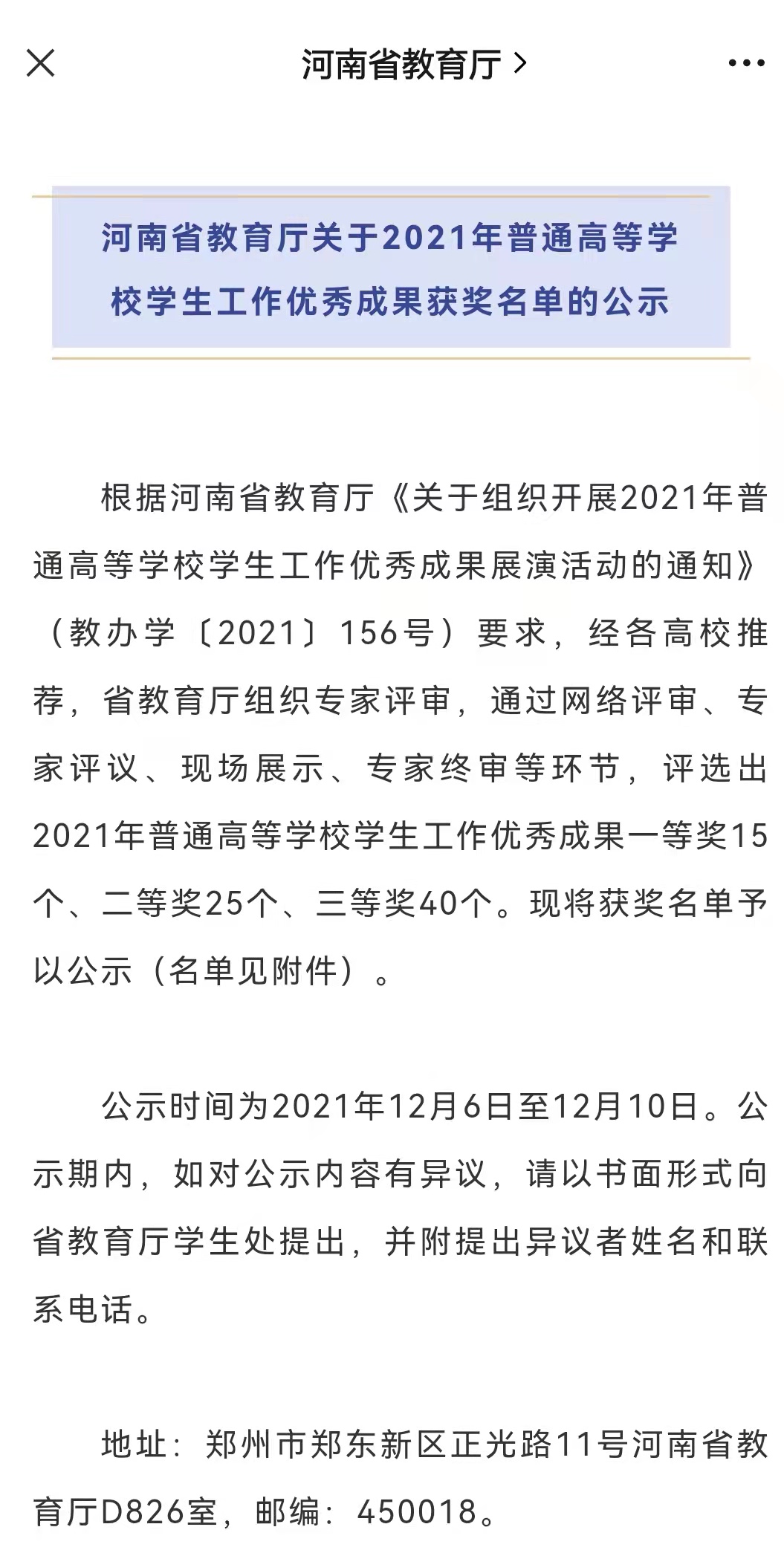 近日,2021年河南省普通高等学校学生工作优秀成果名单揭晓,我校王洪燕老师主持的“成蝶计划”心理育人项目荣获三等奖,这是我校首次获得河南省普通高等学校学生工作优秀成果奖。2021年河南省普通高等学校学