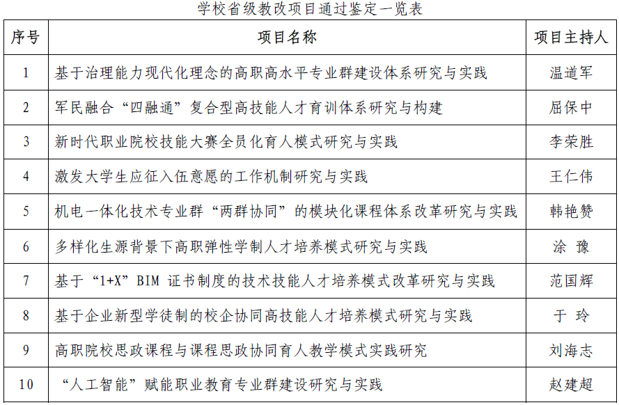 日前,河南省教育厅发布《关于公布2021年河南省高等教育教学改革研究与实践项目鉴定名单的通知》,由我校主持的“基于治理能力现代化理念的高职高水平专业群建设体系研究与实践”等共计10个项目全部顺利通过鉴