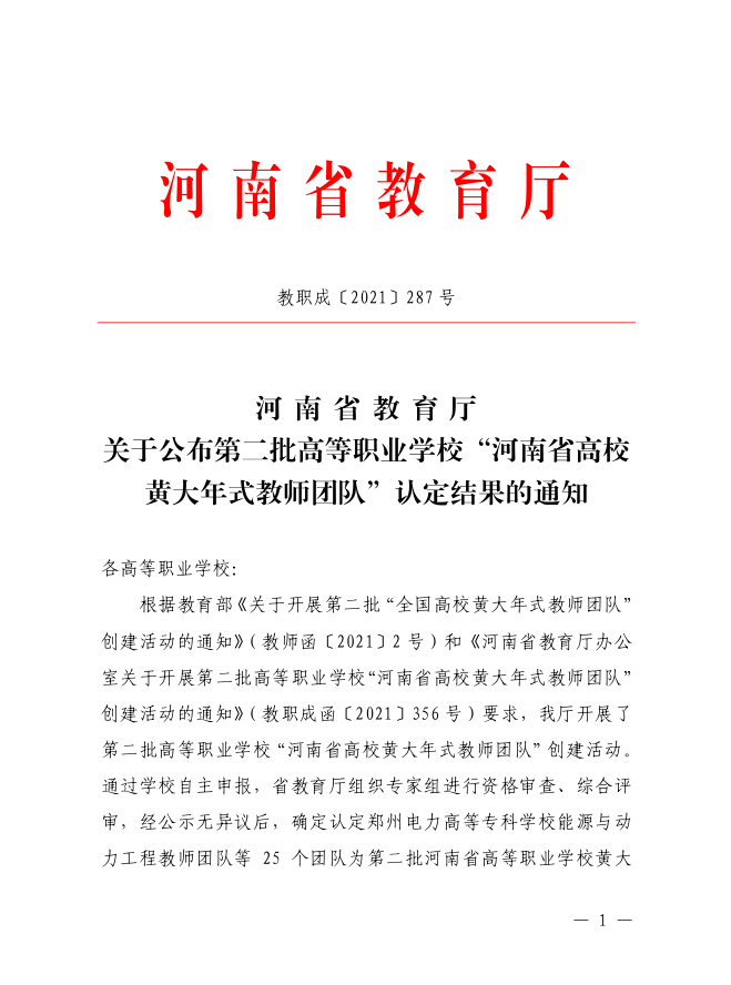 8月11日,河南省教育厅印发《关于公布第二批高等职业学校“河南省高校黄大年式教师团队”认定结果的通知》,我校史增芳教授带领的“智能控制与应用教师团队”被河南省教育厅认定为第二批河南省高等职业学校黄大年