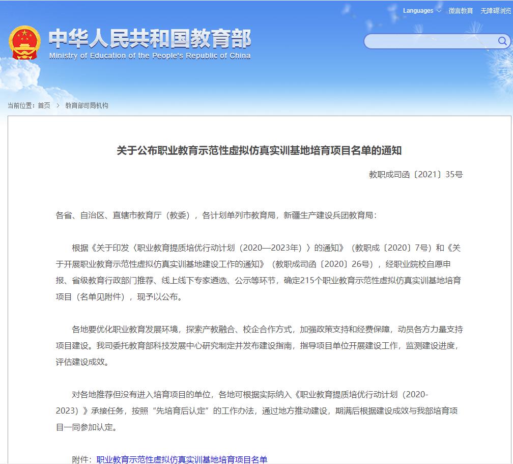 2021年8月4日,教育部发布《关于公布职业教育示范性虚拟仿真实训基地培育项目名单的通知》(教职成司函〔2021〕35号)的通知,我校“建筑工程施工全过程虚拟仿真实训基地”成功入选国家级职业教育示范性