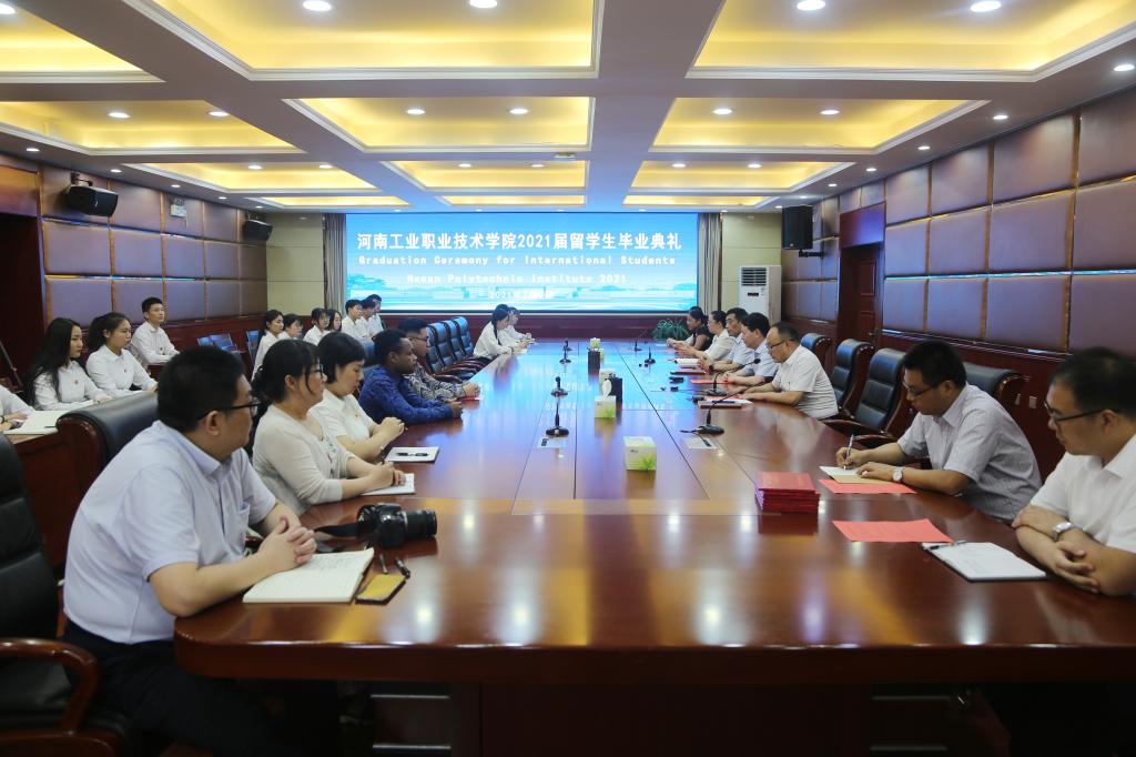 7月2日,新葡的京集团8814vip2021届留学生毕业典礼在行政楼四楼会议室隆重举行,同时通过钉钉向远在印度尼西亚的留学生毕业生进行线上直播。校长王伟教授、工会主席屈保中教授出席,文化旅游与国际教育学院党