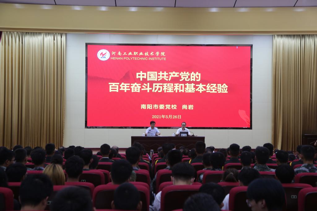 在庆祝中国共产党百年华诞之际,按照市委党史学习教育的统一安排部署,5月26日,学校邀请南阳市委党史宣讲团成员、市委党校尚岩老师在学术报告厅为师生做党史学习专题宣讲报告。学校领导温道军、王伟、杜建根、李