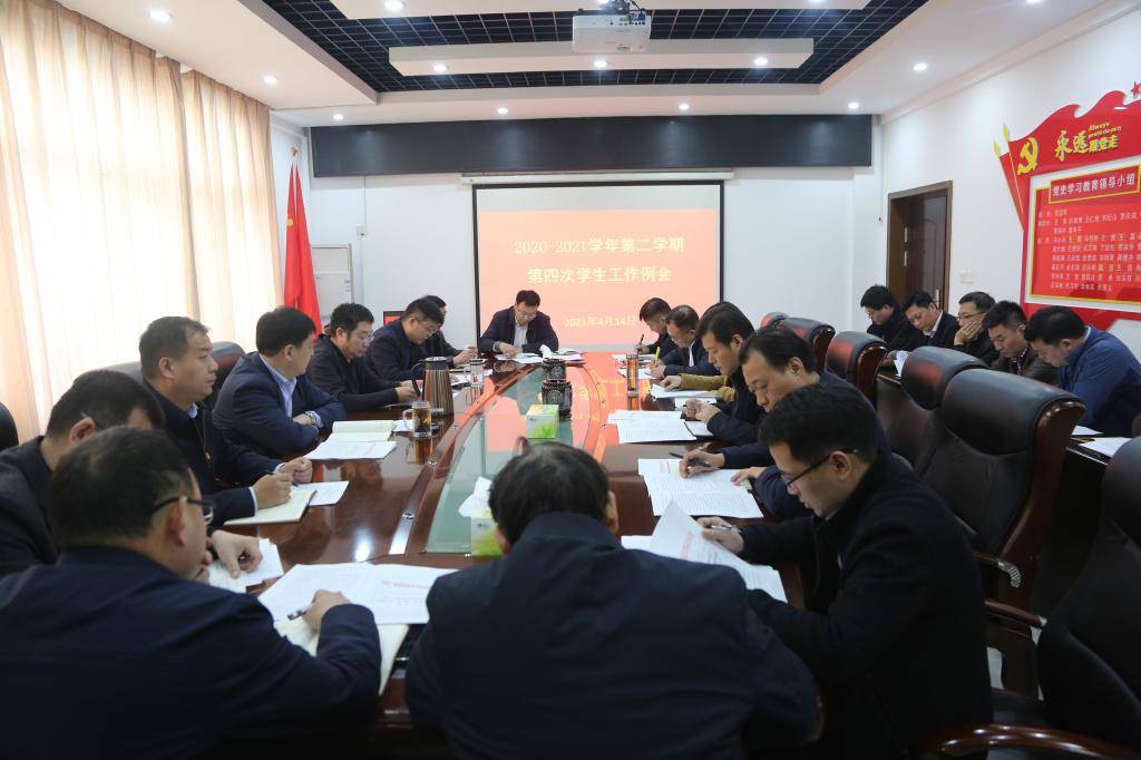 4月14日下午,我校本学期第四次学生工作例会在孔明路校区行政楼三楼会议室召开。党委书记温道军、副校长王仁伟出席会议,学生处、团委、保卫处、心理健康教育中心、后勤处、后勤服务中心负责人以及各院系党总支书