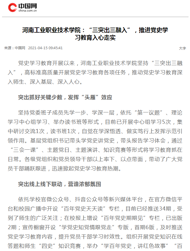 2021年4月14日-15日,中国网、中国教育网、环球网、搜狐网、中华网、中华高校网、中新资讯网、腾讯、哔哩哔哩、今日头条、河南高校资讯网、河南经济论坛等数十家媒体对我校多措并举扎实开展党史学习教育进