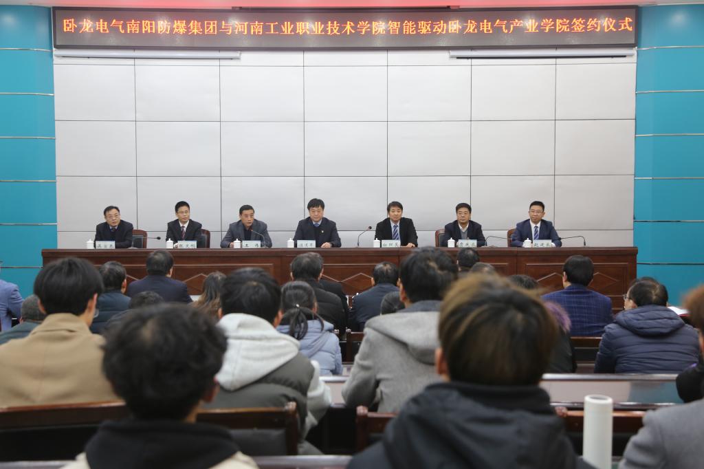 学校举行智能驱动卧龙电气产业学院签约仪式12月8日,学校与卧龙电气南阳防爆集团股份有限公司共建智能驱动卧龙电气产业学院签约仪式,在学校孔明路校区行政楼一楼会议室举行,双方签订了《共建智能驱动卧龙电气产