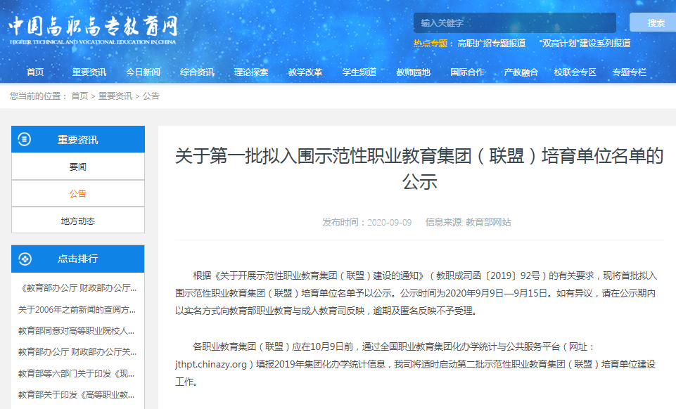 日前,首批国家示范性职业教育集团(联盟)评选结果公布,我校作为牵头单位的河南国防科技工业高等职业教育集团成功入选,成为首批150个国家示范性职教集团之一。此次评选经过申报、形式审查、专家评审、网上公示