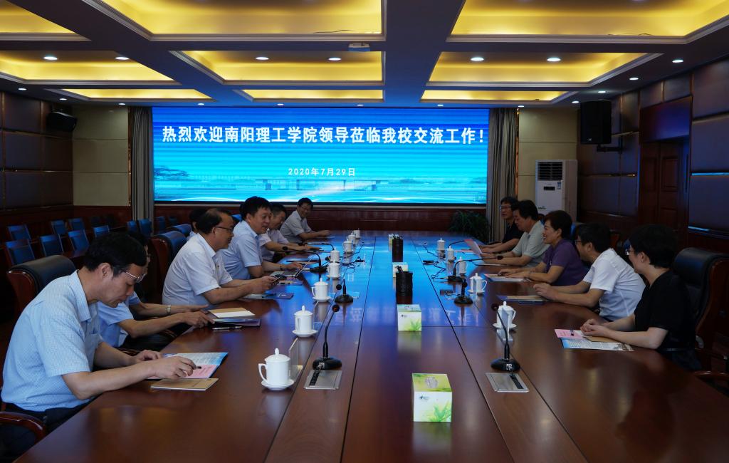 2020年7月29日,南阳理工学院党委书记刘荣英、校长安士伟等一行到我校访问,学校校领导温道军、王伟、杜建根、王仁伟、刘纪山、李荣胜、樊有平,党政办等单位负责人与来宾在行政楼第四会议室座谈交流,共话兄