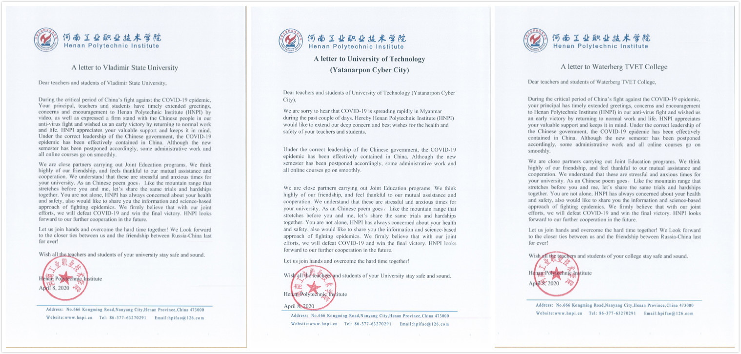 病毒没有国界,疫情不分种族。随着新冠疫情在全球多国暴发,我们也时刻关注着国外合作院校和教育机构师生员工的健康和平安。近日,学校分别致信德国爱科特学院、俄罗斯弗拉基米尔国立大学、西班牙胡安卡洛斯国王大学