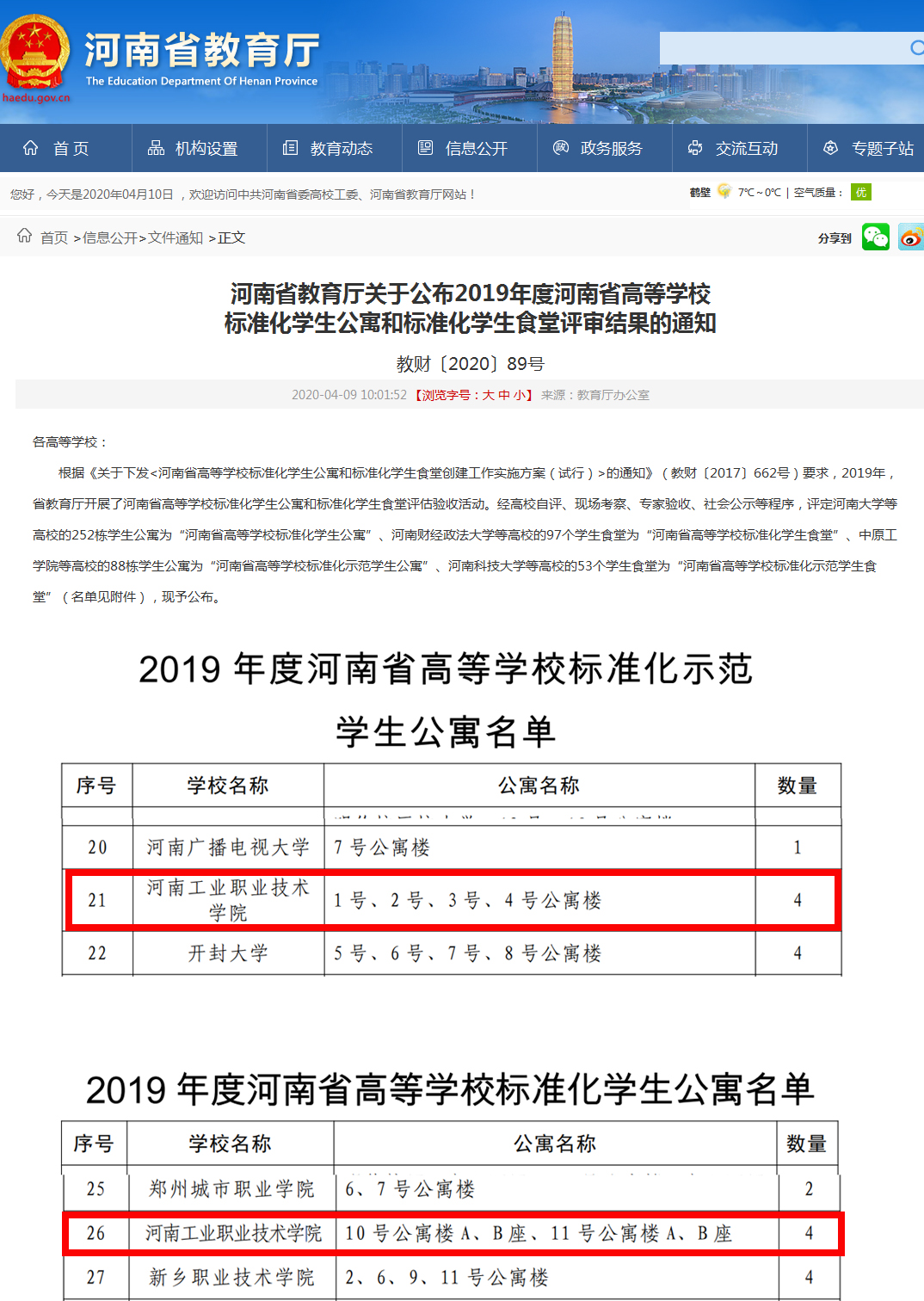 4月10日,河南省教育厅公布了2019年度河南省高等学校标准化学生公寓评审结果。我校孔明路校区1、2、3、4公寓楼获得2019年度河南省高等学校标准化示范学生公寓荣誉称号,10公寓A、B座和11公寓A