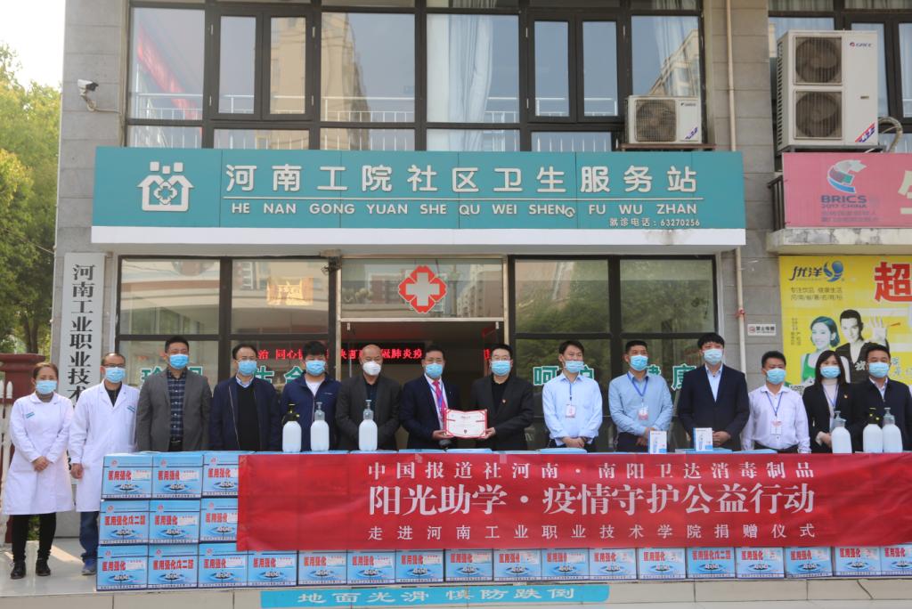 4月9日下午,河南省金阳光慈善救助基金会携手河南好故事文化传媒股份有限公司、河南东鑫健康科技发展有限公司、南阳市卫达消毒制品有限公司等爱心企业向学校捐赠价值2.5万元的疫情防控物资,助力学校疫情防控工