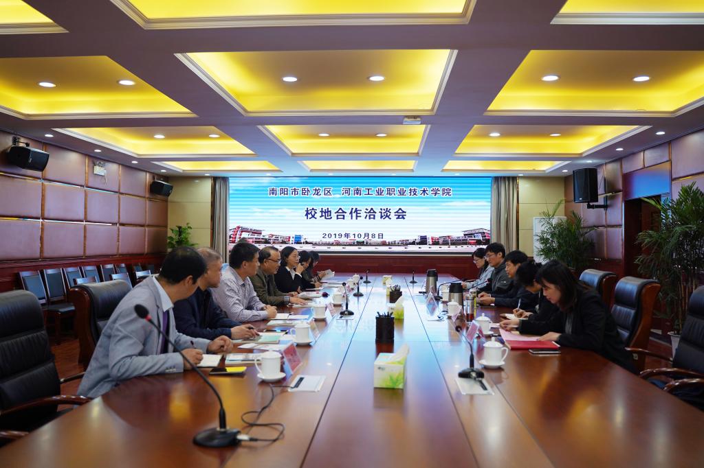10月8日下午,南阳市卧龙区委常委、组织部部长徐文凯,组织部副部长李瑛、组织部人才办副主任邢伟凡等一行五人来校洽谈合作。副校长杜建根出席会议,产教融合发展中心、教务处、科技外事处、继续教育学院、组织部
