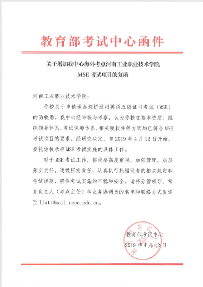 近日,教育部考试中心复函我校,批复我校成立剑桥通用英语五级证书考试考点,开展考试的组织实施及培训等相关工作。剑桥通用英语五级证书考试(MSE)是由剑桥大学开发的全球认可的英语语言水平考试,由教育部引进