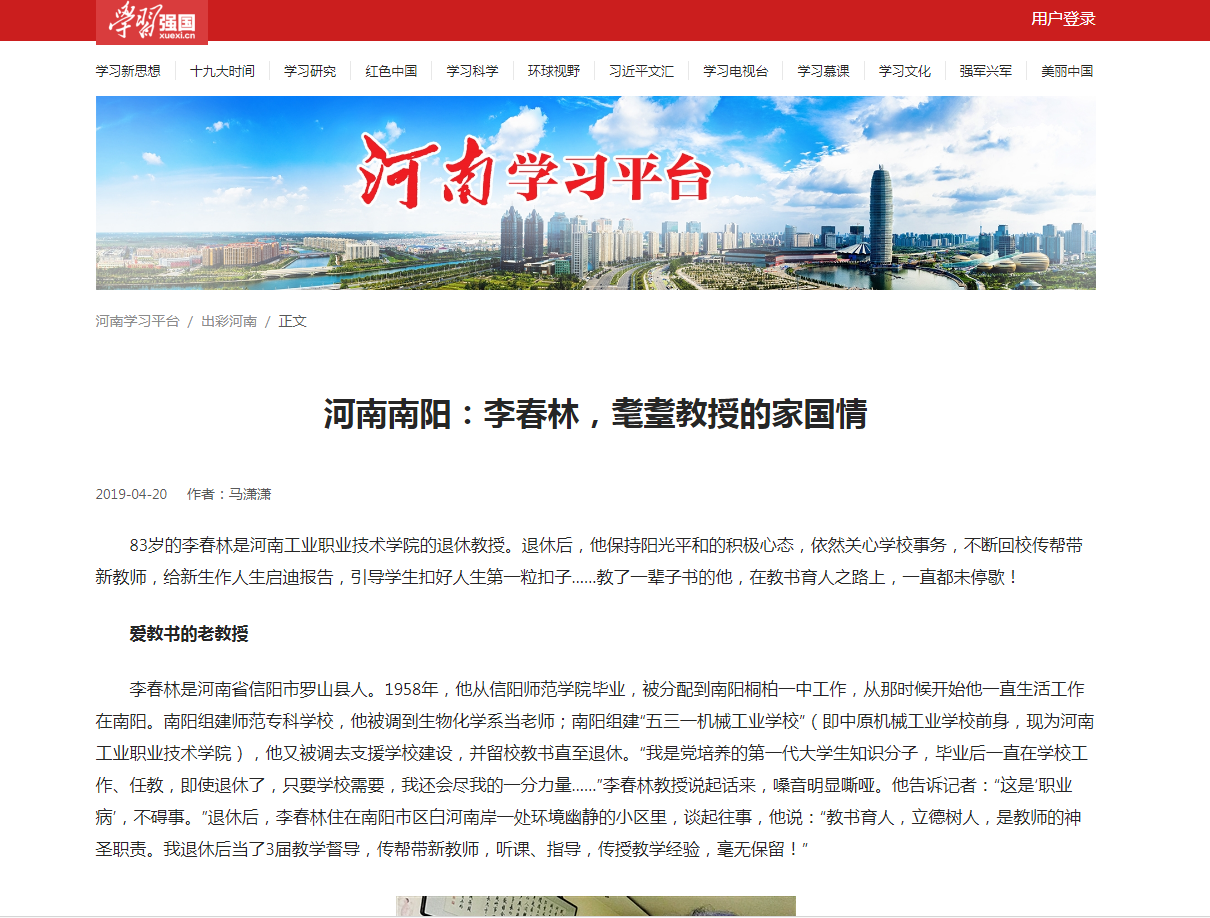 学习强国河南学习平台、《南阳晚报》等媒体报道我校退休教授李春林事迹