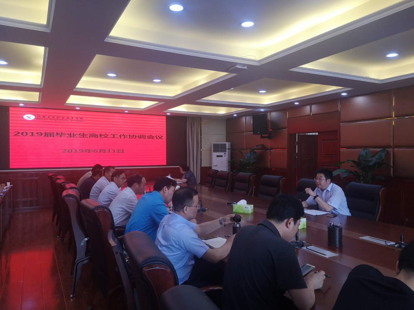 6月11日下午3:10,学校在孔明路校区行政楼四楼会议室召开2019届毕业生离校工作协调会。副校长王仁伟出席会议,校党政办、组织部、宣传部、教务处、学生处、保卫处、招生就业处、财务处、网络管理中心、艺